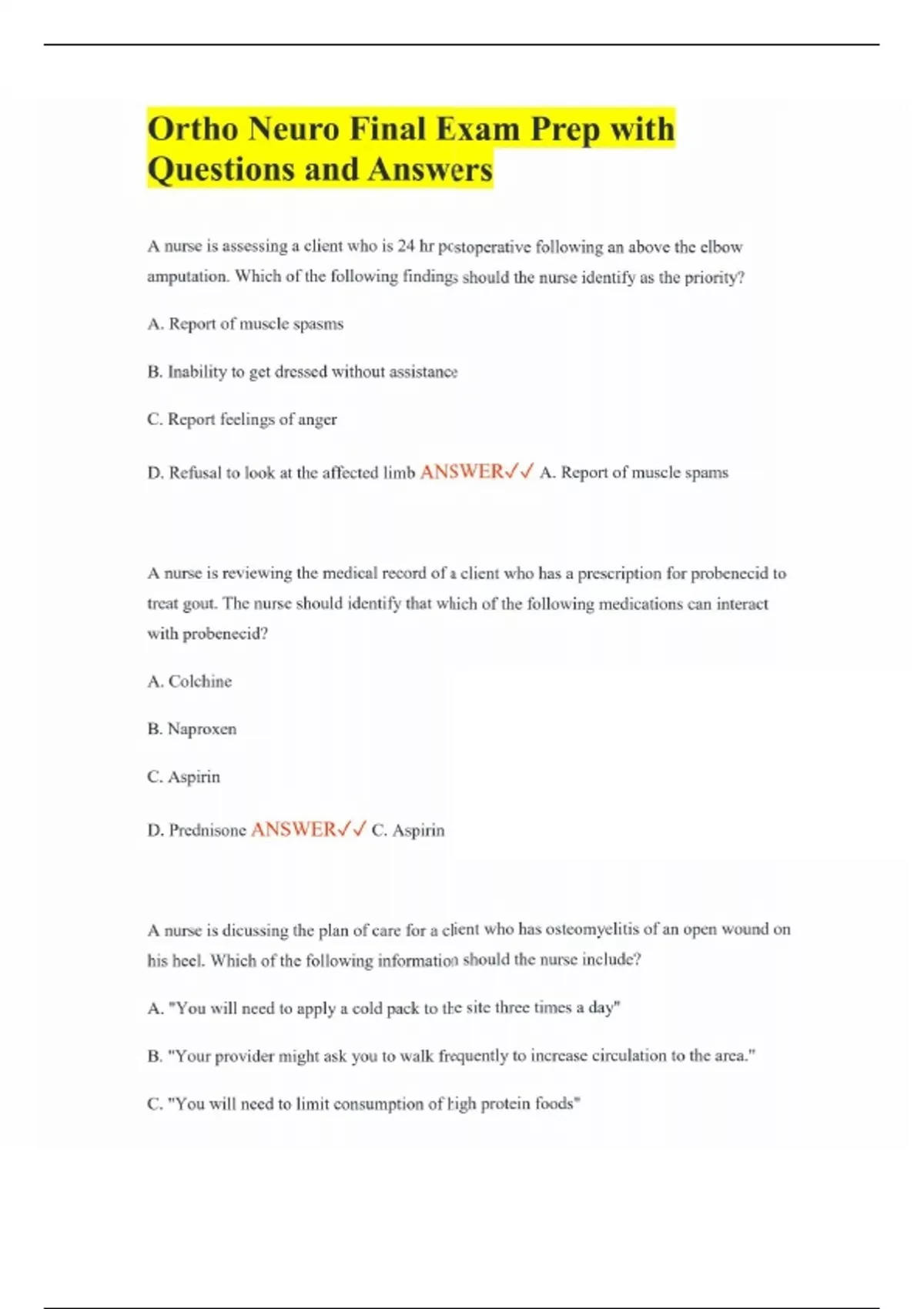 Ortho Neuro Final Exam Prep with Questions and Answers A nurse is assessing a client who is 24 hr postoperative following an above the elbow amputation. Which of the following findings should the nurse identify as the priority? A. Report of muscle spasms B. Inability to get dressed without assistance C. Report feelings of anger D. Refusal to look at the affected limb ANSWER A. Report of muscle spams A nurse is reviewing the medical record of a client who has a prescription for probenecid to treat gout. The nurse should identify that which of the following medications can interact with probenecid? A. Colchine B. Naproxen C. Aspirin D. Prednisone ANSWER C. Aspirin A nurse is dicussing the plan of care for a client who has osteomyelitis of an open wound on his heel. Which of the following information should the nurse include? A. "You will need to apply a cold pack to the site three times a day" B. "Your provider might ask you to walk frequently to increase circulation to the area." C. "You will need to limit consumption of high protein foods"