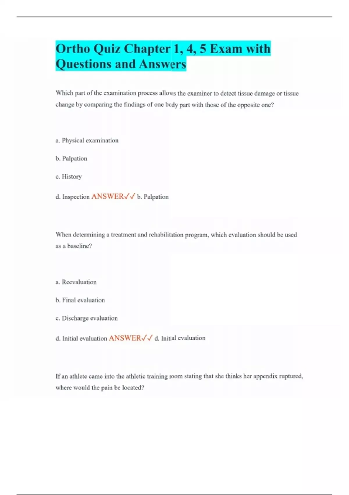 Ortho Quiz Chapter 1, 4, 5 Exam with Questions and Answers Which part of the examination process allows the examiner to detect tissue damage or tissue change by comparing the findings of one body part with those of the opposite one? a. Physical examination b. Palpation c. History d. Inspection ANSWER b. Palpation When determining a treatment and rehabilitation program, which evaluation should be used as a baseline? a. Reevaluation b. Final evaluation c. Discharge evaluation d. Initial evaluation ANSWER d. Initial evaluation If an athlete came into the athletic training room stating that she thinks her appendix ruptured, where would the pain be located? a. Upper right quadrant b. Lower left quadrant c. Upper left quadrant d. Lower right quadrant ANSWER d. Lower right quadrant