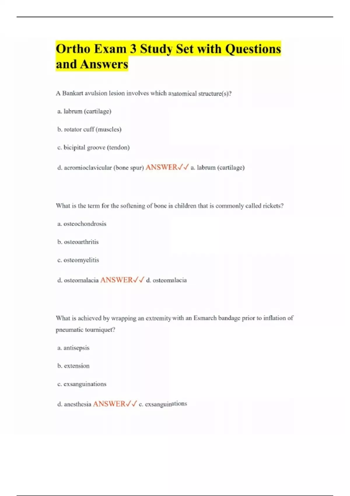 Ortho Exam 3 Study Set with Questions and Answers A Bankart avulsion lesion involves which anatomical structure(s)? a. labrum (cartilage) b. rotator cuff (muscles) c. bicipital groove (tendon) d. acromioclavicular (bone spur) ANSWER a. labrum (cartilage) What is the term for the softening of bone in children that is commonly called rickets? a. osteochondrosis b. osteoarthritis c. osteomyelitis d. osteomalacia ANSWER d. osteomalacia What is achieved by wrapping an extremity with an Esmarch bandage prior to inflation of pneumatic tourniquet? a. antisepsis b. extension c. exsanguinations d. anesthesia ANSWER c. exsanguinations