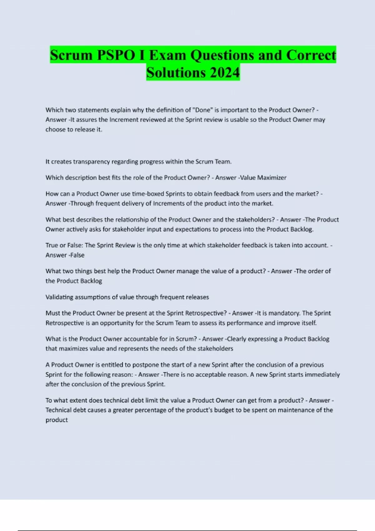 Scrum PSPO I Exam Questions and Correct Solutions 2024 Which two statements explain why the definition of "Done" is important to the Product Owner? - Answer -It assures the Increment reviewed at the Sprint review is usable so the Product Owner may choose to release it. It creates transparency regarding progress within the Scrum Team. Which description best fits the role of the Product Owner? - Answer -Value Maximizer How can a Product Owner use time-boxed Sprints to obtain feedback from users and the market? - Answer -Through frequent delivery of Increments of the product into the market. What best describes the relationship of the Product Owner and the stakeholders? - Answer -The Product Owner actively asks for stakeholder input and expectations to process into the Product Backlog. True or False: The Sprint Review is the only time at which stakeholder feedback is taken into account. - Answer -False What two things best help the Product Owner manage the value of a product? - Answer -The order of the Product Backlog Validating assumptions of value through frequent releases Must the Product Owner be present at the Sprint Retrospective? - Answer -It is mandatory. The Sprint Retrospective is an opportunity for the Scrum Team to assess its performance and improve itself. What is the Product Owner accountable for in Scrum? - Answer -Clearly expressing a Product Backlog that maximizes value and represents the needs of the stakeholders A Product Owner is entitled to postpone the start of a new Sprint after the conclusion of a previous Sprint for the following reason: - Answer -There is no acceptable reason. A new Sprint starts immediately after the conclusion of the previous Sprint. To what extent does technical debt limit the value a Product Owner can get from a product? - Answer - Technical debt causes a greater percentage of the product's budget to be spent on maintenance of the productThe velocity at which new functionality can be created is reduced when you have technical debt. What two things should be done if the Product Owner is unavailable? - Answer -Within the Sprint, the Development Team makes the best decisions possible to assure progress toward the Sprint Goal, realigning with the Product Owner once he/she is available again. In a permanent state of unavailability, a new Product Owner needs to be appointed. Development efforts without a Product Owner are not employing Scrum. Learning turns into 'validated learning' when assumptions and goals can be assessed through results. What is a key way for a Product Owner to apply validated learning? - Answer -Release an Increment to the market to learn about the business assumptions built into the product. What pre-conditions must be fulfilled in order to allow Sprint Planning to begin? - Answer -There are no such pre-conditions True or False: The Scrum Team should choose at least one high priority process improvement, identified during the Sprint Retrospective, and place it in the Product Backlog. - Answer -False, to ensure continuous improvement, the Sprint Backlog rather than the Product Backlog includes at least one high priority process improvement identified in the previous Sprint Retrospective meeting. A Product Owner is essentially the same thing as a traditional Project Manager? - Answer -False What are two typical activities for a Product Owner in a Sprint? - Answer -Work with the Development Team on Product Backlog refinement.