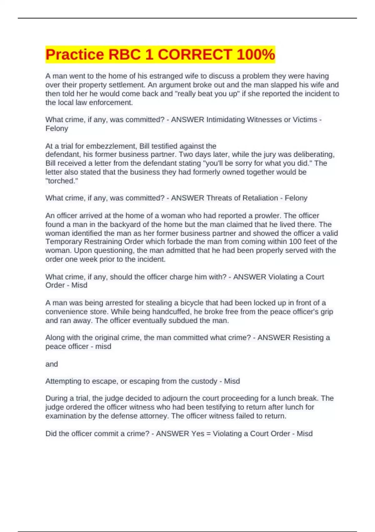 A man went to the home of his estranged wife to discuss a problem they were having over their property settlement. An argument broke out and the man slapped his wife and then told her he would come back and "really beat you up" if she reported the incident to the local law enforcement. What crime, if any, was committed? - ANSWER Intimidating Witnesses or Victims - Felony At a trial for embezzlement, Bill testified against the defendant, his former business partner. Two days later, while the jury was deliberating, Bill received a letter from the defendant stating "you'll be sorry for what you did." The letter also stated that the business they had formerly