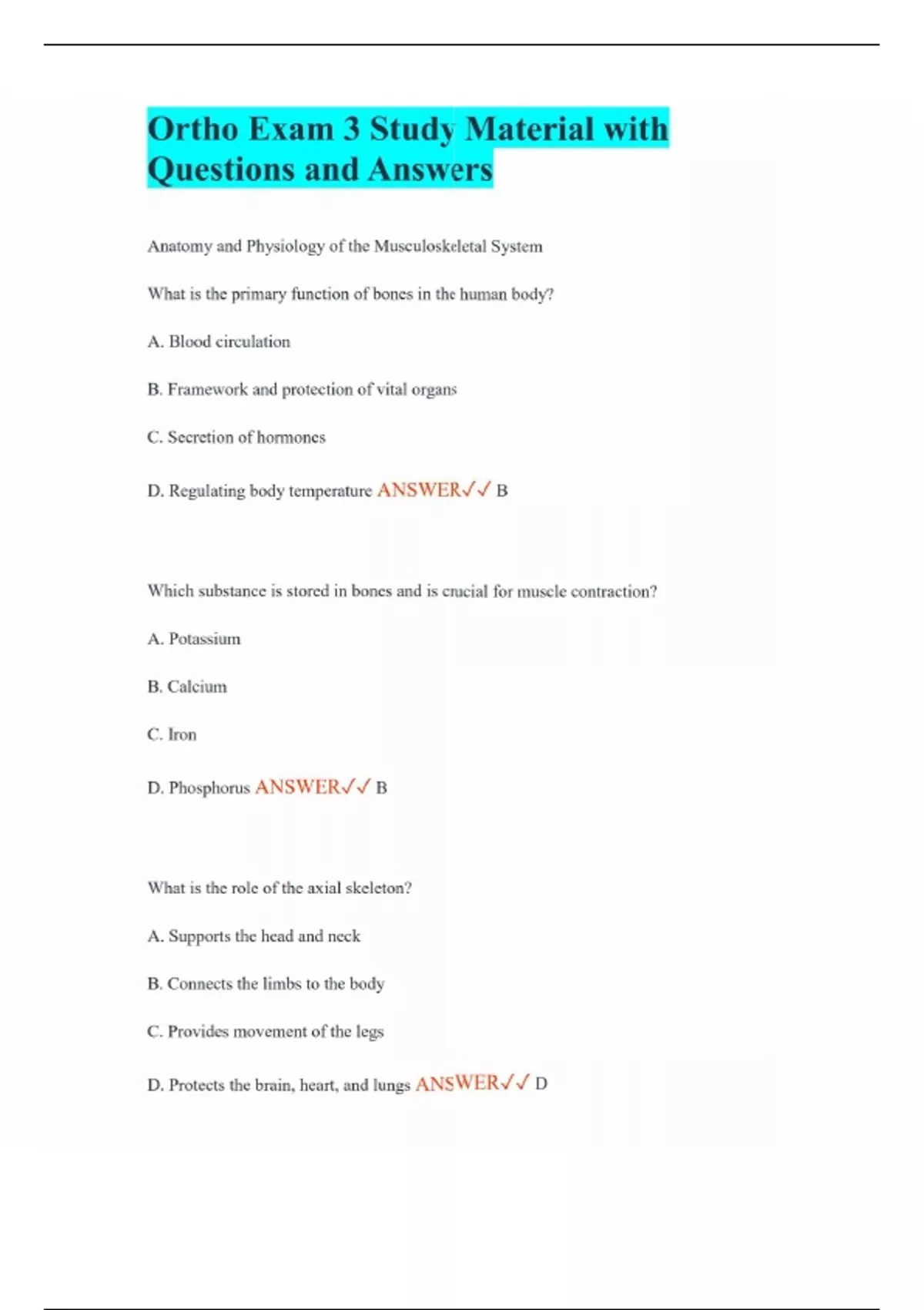 Ortho Exam 3 Study Material with Questions and Answers Anatomy and Physiology of the Musculoskeletal System What is the primary function of bones in the human body? A. Blood circulation B. Framework and protection of vital organs C. Secretion of hormones D. Regulating body temperature ANSWER B Which substance is stored in bones and is crucial for muscle contraction? A. Potassium B. Calcium C. Iron D. Phosphorus ANSWER B What is the role of the axial skeleton? A. Supports the head and neck B. Connects the limbs to the body C. Provides movement of the legs D. Protects the brain, heart, and lungs ANSWER D