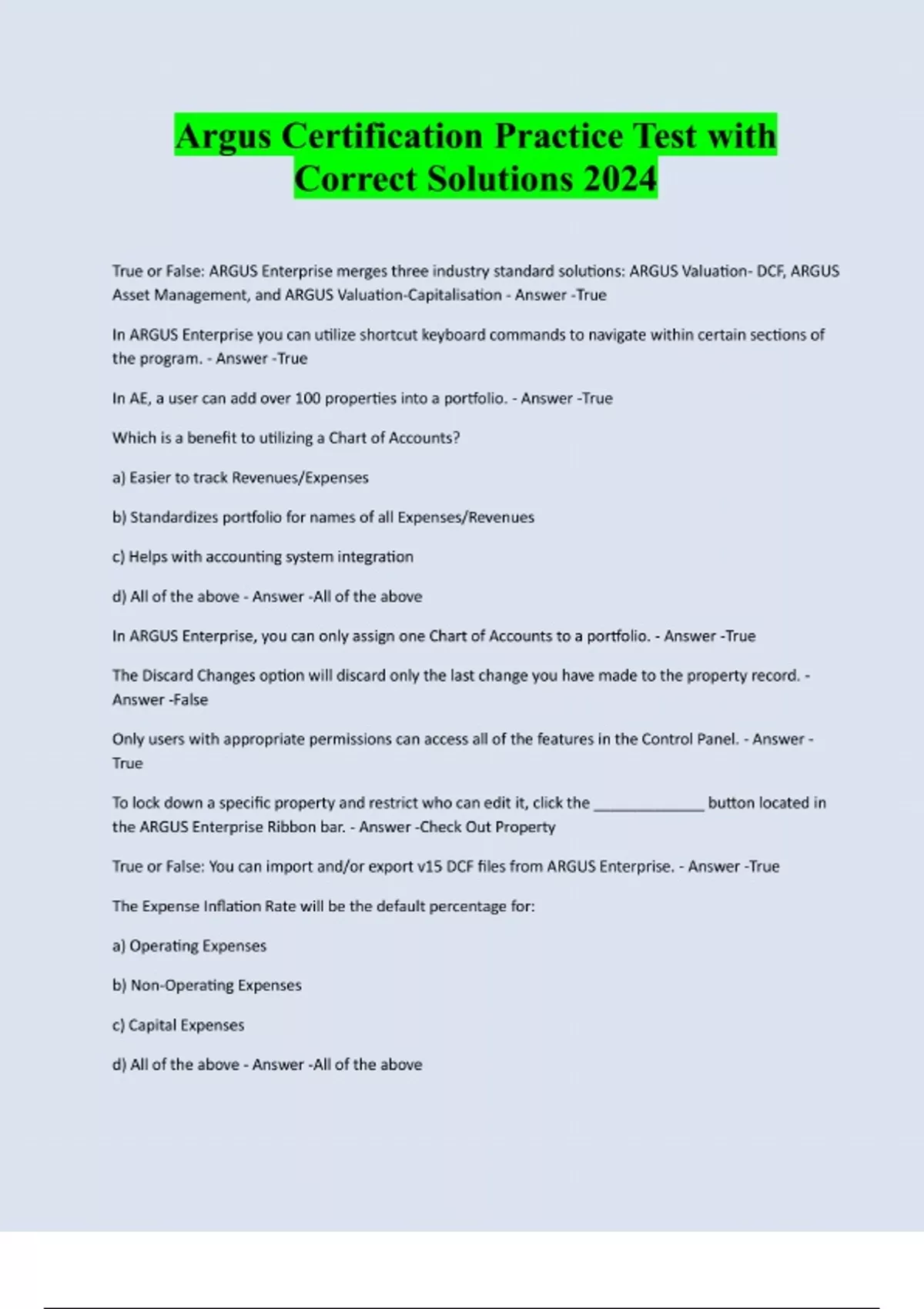 Argus Certification Practice Test with Correct Solutions 2024 True or False: ARGUS Enterprise merges three industry standard solutions: ARGUS Valuation- DCF, ARGUS Asset Management, and ARGUS Valuation-Capitalisation - Answer -True In ARGUS Enterprise you can utilize shortcut keyboard commands to navigate within certain sections of the program. - Answer -True In AE, a user can add over 100 properties into a portfolio. - Answer -True Which is a benefit to utilizing a Chart of Accounts? a) Easier to track Revenues/Expenses b) Standardizes portfolio for names of all Expenses/Revenues c) Helps with accounting system integration d) All of the above - Answer -All of the above In ARGUS Enterprise, you can only assign one Chart of Accounts to a portfolio. - Answer -True The Discard Changes option will discard only the last change you have made to the property record. - Answer -False Only users with appropriate permissions can access all of the features in the Control Panel. - Answer - True To lock down a specific property and restrict who can edit it, click the _____________ button located in the ARGUS Enterprise Ribbon bar. - Answer -Check Out Property True or False: You can import and/or export v15 DCF files from ARGUS Enterprise. - Answer -True The Expense Inflation Rate will be the default percentage for: a) Operating Expenses b) Non-Operating Expenses c) Capital Expenses d) All of the above - Answer -All of the aboveTrue or False: Every inflation category must be given a number or it will default to the General Inflation Rate. - Answer -False Assuming a 60% occupancy, calculate the Vending Machine revenue in Year 1 of the analysis (revenue is $13,000 with fixed percentage of 0%). - Answer -$7,800 (.6*13000) Assuming a 0% occupancy, calculate the Vending Machine revenue in Year 1 of the analysis. - Answer -$0 Assuming 100% occupancy, calculate the Vending Machine revenue in Year 1 of the analysis. - Answer - $13,000 What is the Capital Expense amount that will appear on the Cash Flow? - Answer -$63,654??? Free Rent, by default, kick in at the beginning of the _________. - Answer -Tenant's Lease