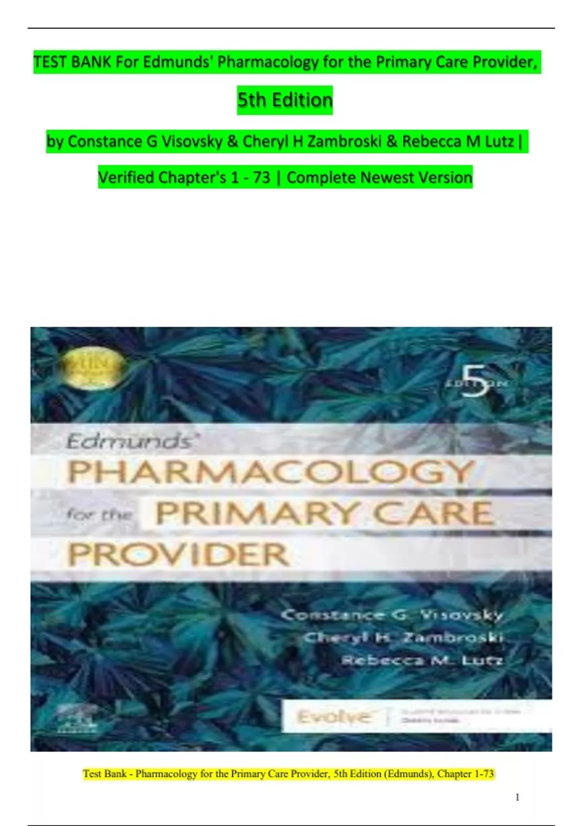 This document is a verified and complete test bank for Edmunds' Pharmacology for the Primary Care Provider (5th Edition) by Constance G. Visovsky, Cheryl H. Zambroski, and Rebecca M. Lutz. It contains multiple-choice questions and answers for all chapters (1 through 73), covering essential pharmacologic principles and clinical applications in primary care. Topics include prescriptive authority, pharmacokinetics, special populations (geriatrics, pediatrics, pregnancy), OTC medications, evidence-based practice, and more. Ideal for exam preparation and knowledge reinforcement for nursing and NP students.