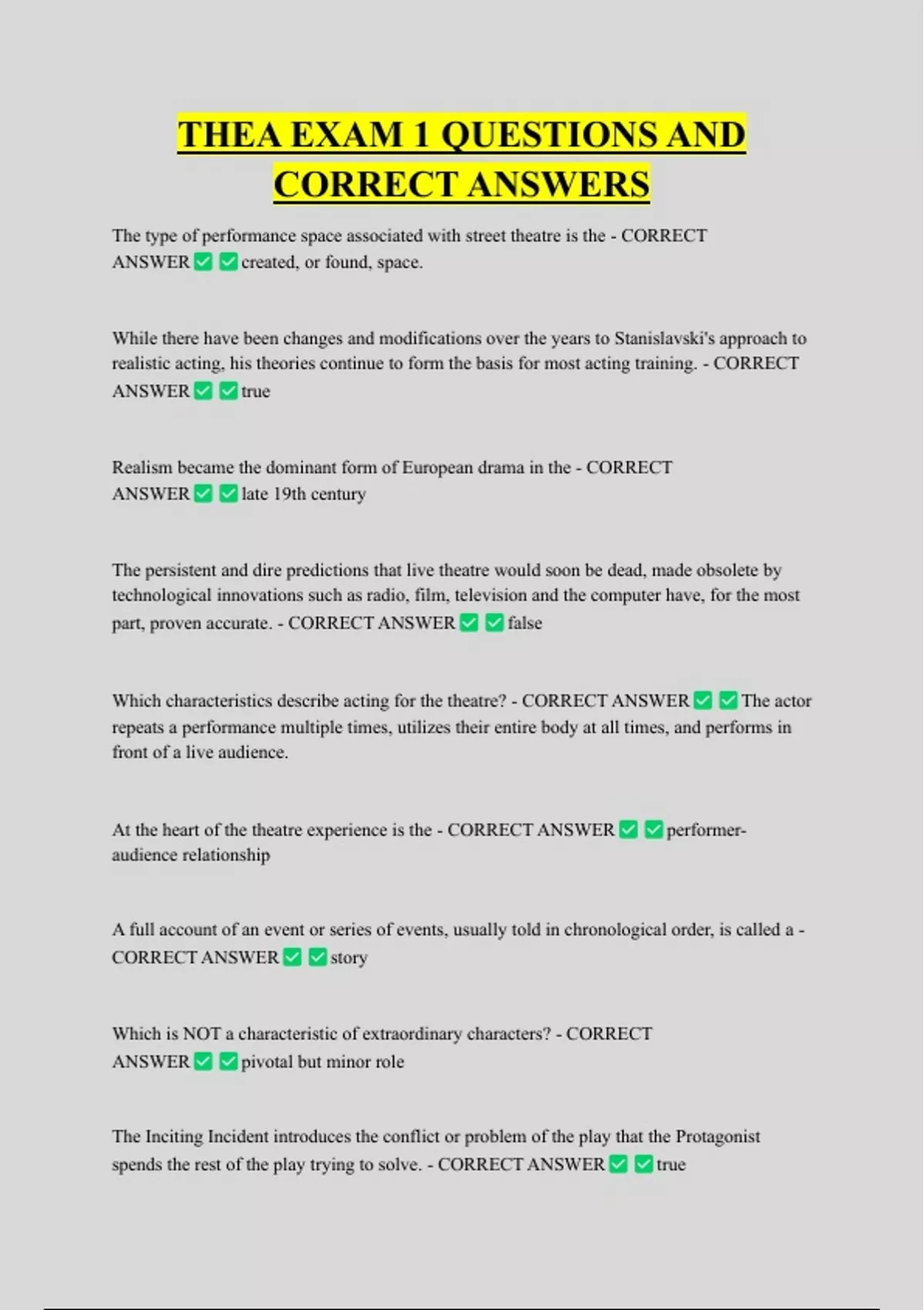 THEA EXAM 1 QUESTIONS AND CORRECT ANSWERS The type of performance space associated with street theatre is the - CORRECT ANSWER created, or found, space. While there have been changes and modifications over the years to Stanislavski's approach to realistic acting, his theories continue to form the basis for most acting training. - CORRECT ANSWER true