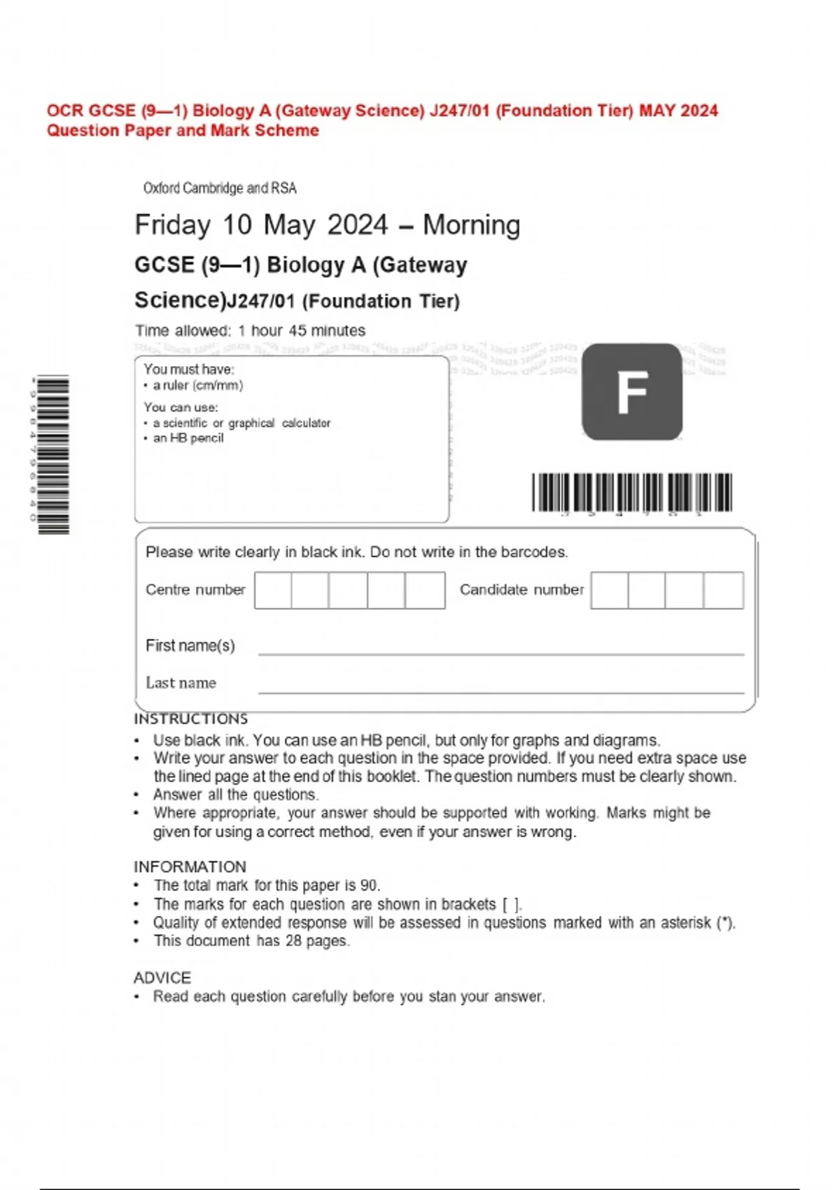 OCR GCSE (9—1) Biology A (Gateway Science) J247/01 (Foundation Tier) MAY 2024 Question Paper and Mark Scheme