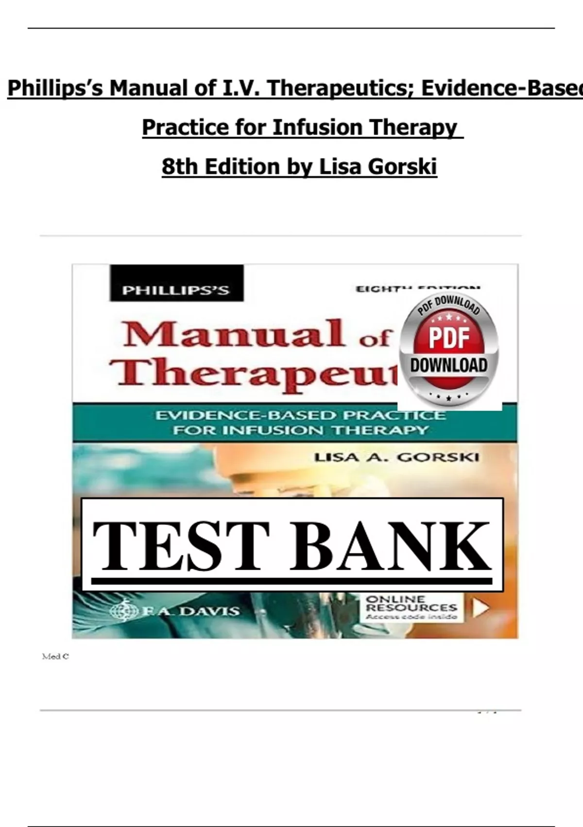 Test Bank for Phillips’s Manual of I.V. Therapeutics; Evidence-Based Practice for Infusion Therapy 8th Edition Lisa Gorski | Complete Guide A+ |Updated 2025