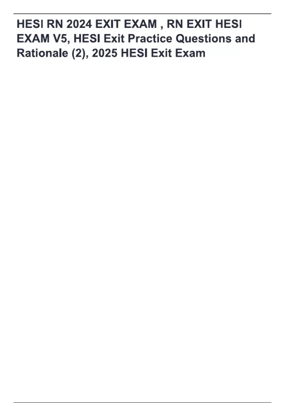 HESI RN 2024 EXIT EXAM, RN EXIT HESI EXAM V5, HESI Exit Practice Questions and Rationale (2), 2025 HESI Exit Exam 2025 Questions with 100% TRUSTED Complete, trusted solutions and explanations.