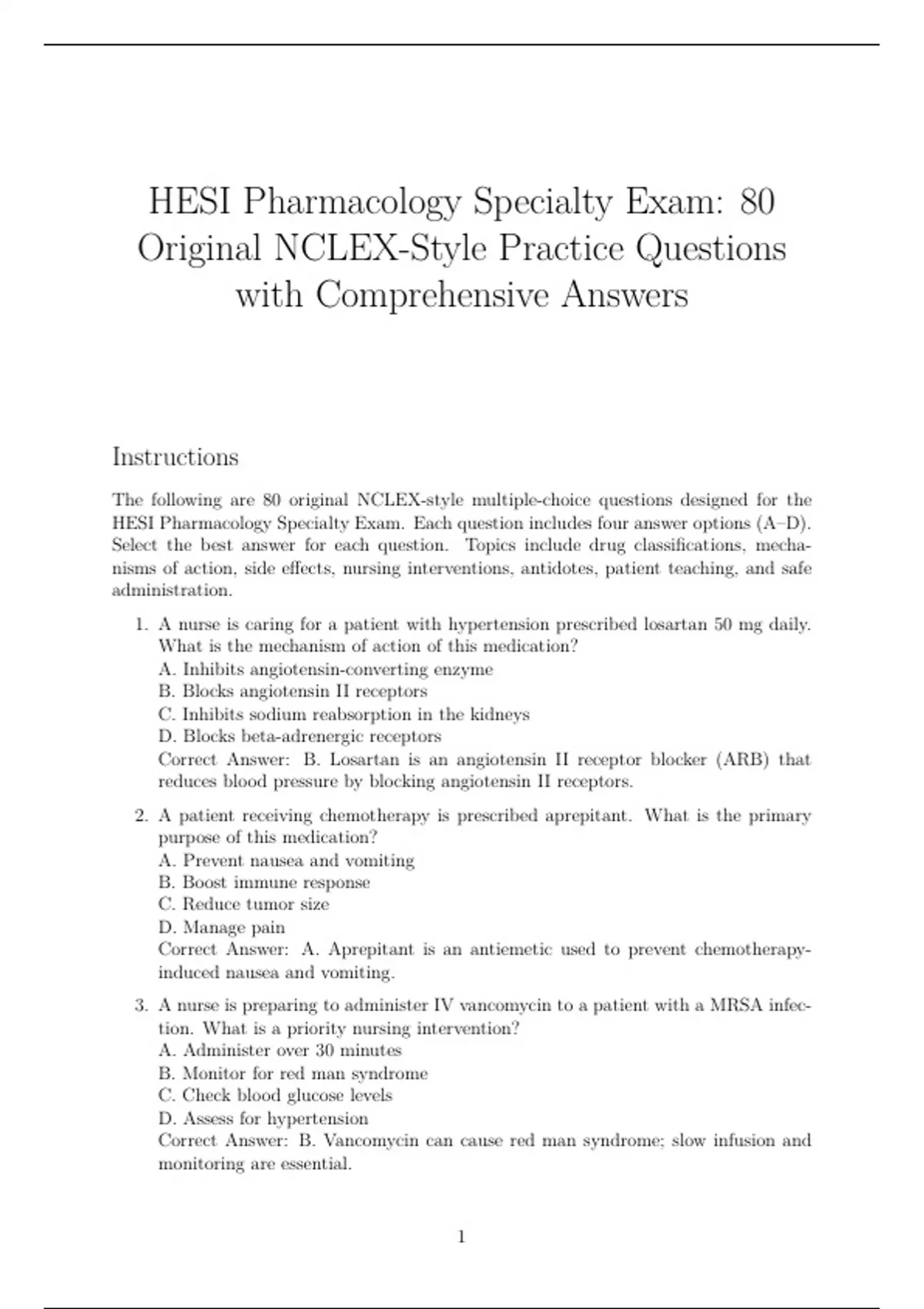 Ace the HESI Pharmacology Specialty Exam with this expertly developed set of 80 high-yield practice questions, complete with correct answers and detailed rationales. Topics include major drug classifications, medication safety, dosage calculations, routes of administration, adverse effects, nursing responsibilities, and patient education. Perfect for nursing students preparing for the HESI, NCLEX, or pharmacology coursework, this guide strengthens your understanding and sharpens your test-taking skills.
