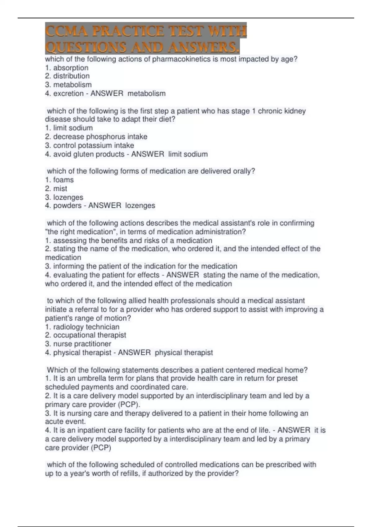 CCMA PRACTICE TEST WITH QUESTIONS AND ANSWERS.