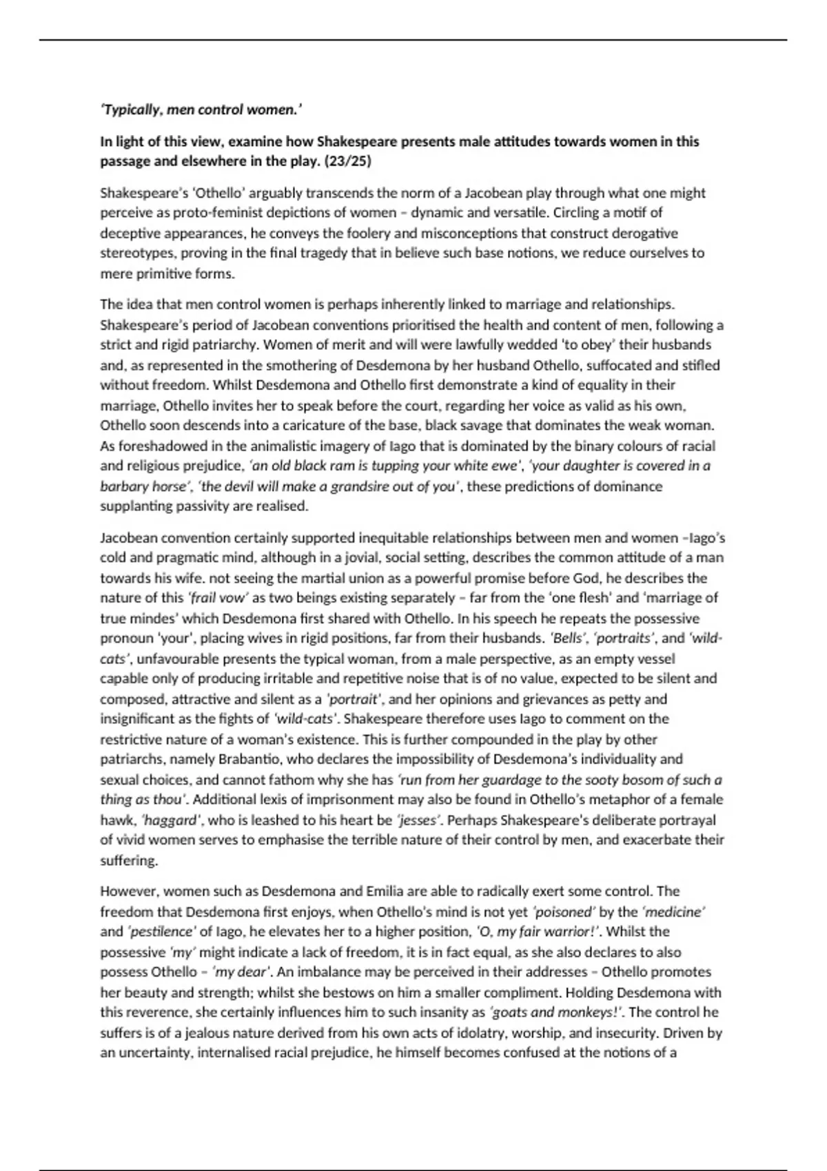 Othello A* A level Examine how Shakespeare presents male attitudes towards women