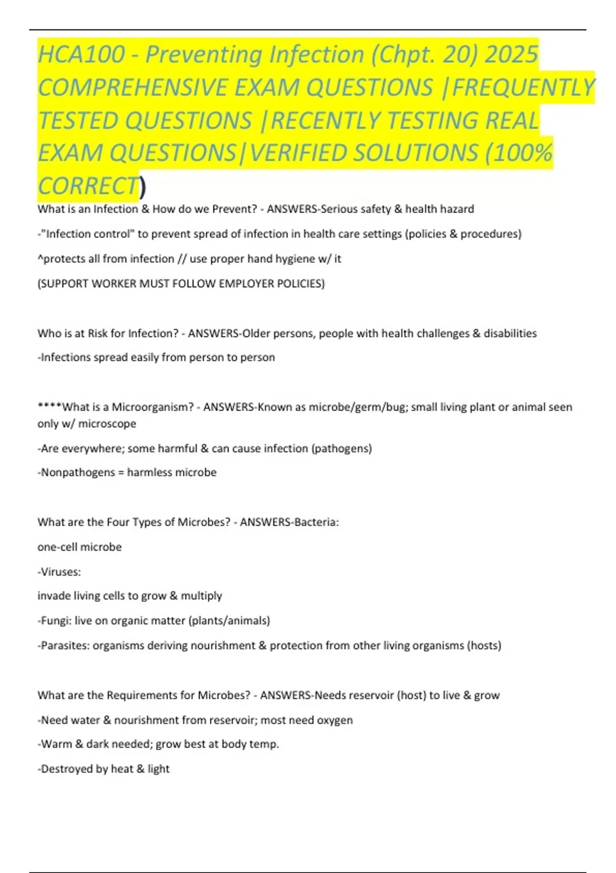 HCA100 - Preventing Infection (Chpt. 20) 2025 COMPREHENSIVE EXAM QUESTIONS |FREQUENTLY TESTED QUESTIONS |RECENTLY TESTING REAL EXAM QUESTIONS|VERIFIED SOLUTIONS (100% CORRECT)