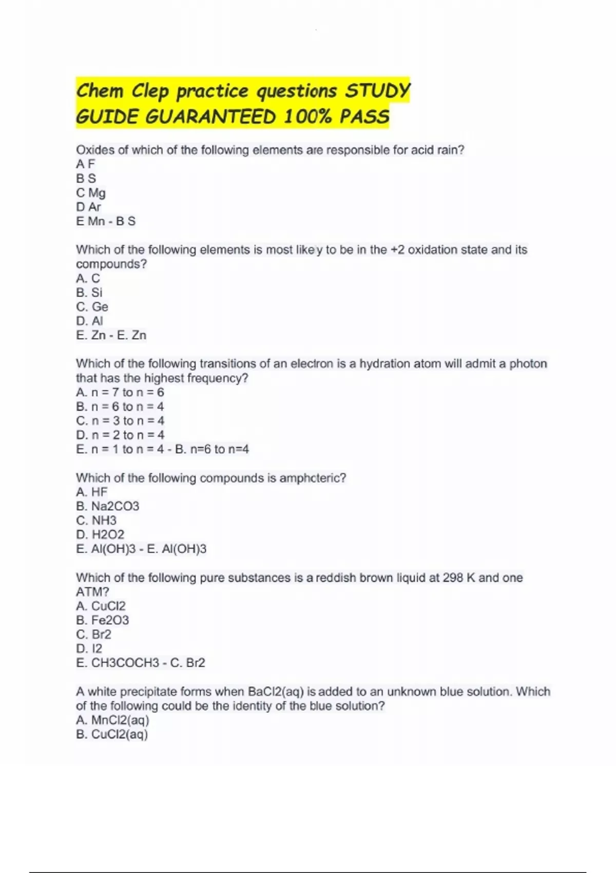 Chem Clep practice questions STUDY GUIDE GUARANTEED 100% PASS