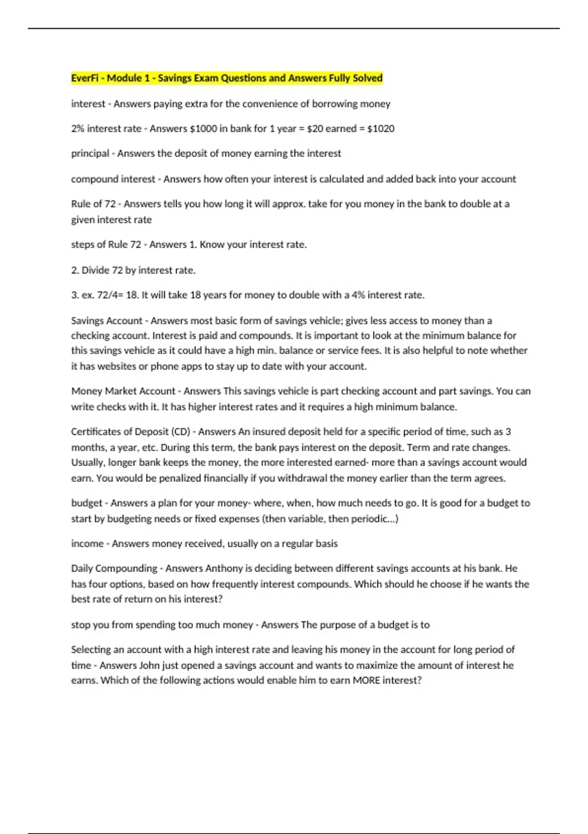 EverFi - Module 1 - Savings Exam Questions and Answers Fully Solved interest - Answers paying extra for the convenience of borrowing money 2% interest rate - Answers $1000 in bank for 1 year = $20 earned = $1020 principal - Answers the deposit of money earning the interest compound interest - Answers how often your interest is calculated and added back into your account Rule of 72 - Answers tells you how long it will approx. take for you money in the bank to double at a given interest rate steps of Rule 72 - Answers 1. Know your interest rate. 2. Divide 72 by interest rate. 3. ex. 72/4= 18. It will take 18 years for money to double with a 4% interest rate. Savings Account - Answers most basic form of savings vehicle; gives less access to money than a checking account. Interest is paid and compounds. It is important to look at the minimum balance for this savings vehicle as it could have a high min. balance or service fees. It is also helpful to note whether it has websites or phone apps to stay up to date with your account. Money Market Account - Answers This savings vehicle is part checking account and part savings. You can write checks with it. It has higher interest rates and it requires a high minimum balance. Certificates of Deposit (CD) - Answers An insured deposit held for a specific period of time, such as 3 months, a year, etc. During this term, the bank pays interest on the deposit. Term and rate changes. Usually, longer bank keeps the money, the more interested earned- more than a savings account would earn. You would be penalized financially if you withdrawal the money earlier than the term agrees.