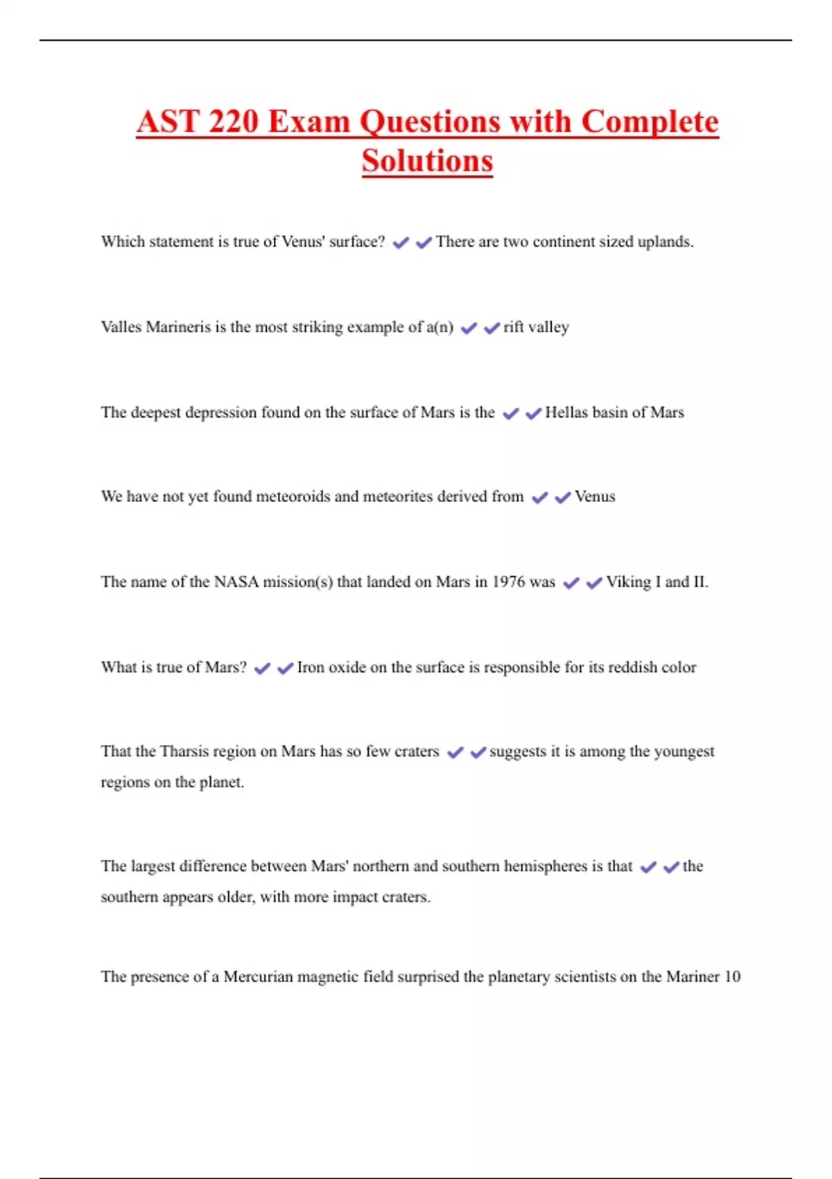 AST 220 Exam Questions with Complete Solutions Which statement is true of Venus' surface? There are two continent sized uplands. Valles Marineris is the most striking example of a(n) rift valley The deepest depression found on the surface of Mars is the Hellas basin of Mars We have not yet found meteoroids and meteorites derived from Venus The name of the NASA mission(s) that landed on Mars in 1976 was Viking I and II.