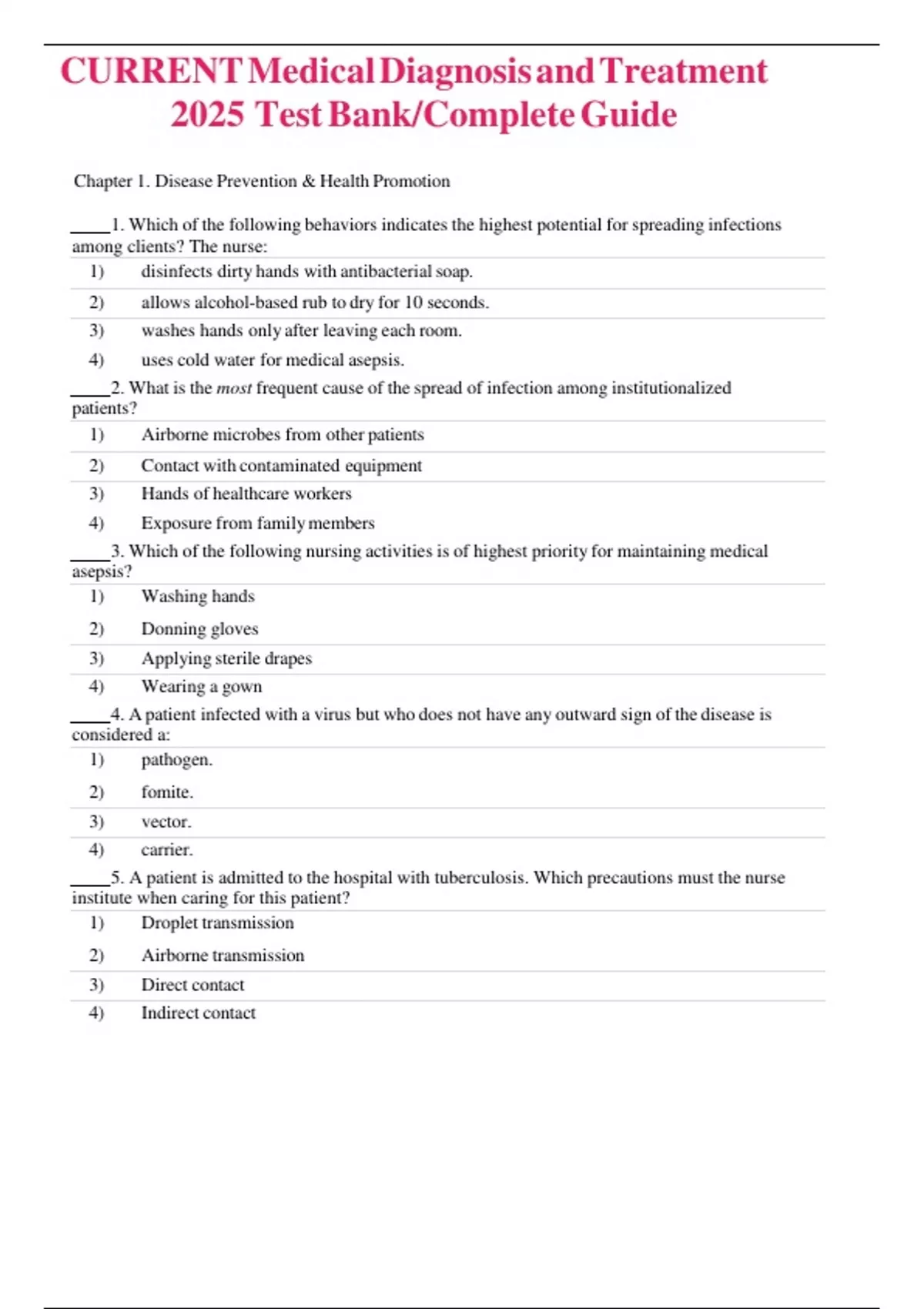 CURRENT Medical Diagnosis and Treatment Testbank/ Studyguide Chapter 1. Disease Prevention & Health Promotion 1. Which of the following behaviors indicates the highest potential for spreading infections among clients? The nurse: 1) disinfects dirty hands with antibacterial soap. 2) allows alcohol-based rub to dry for 10 seconds. 3) washes hands only after leaving each room. 4) uses cold water for medical asepsis. 2. What is the most frequent cause of the spread of infection among institutionalized patients? 1) Airborne microbes from other patients 2) Contact with contaminated equipment 3) Hands of healthcare workers 4) Exposure from family members 3. Which of the following nursing activities is of highest priority for maintaining medical asepsis? 1) Washing hands 2) Donning gloves 3) Applying sterile drapes 4) Wearing a gown 4. A patient infected with a virus but who does not have any outward sign of the disease is considered a: 1) pathogen. 2) fomite. 3) vector. 4) carrier. 5. A patient is admitted to the hospital with tuberculosis. Which precautions must the nurse institute when caring for this patient? 1) Droplet transmission 2) Airborne transmission 3) Direct contact 4) Indirect contact 6. A patient becomes infected with oral candidiasis (thrush) while receiving intravenous antibiotics to treat a systemic infection. Which type of infection has the patient developed? 1) Endogenous nosocomial 2) Exogenous nosocomial 3) Latent 4) Primary 7. A patient admitted to the hospital with pneumonia has been receiving antibiotics for 2 days. His condition has stabilized, and his temperature has returned to normal. Which stage of infection is the patient most likely experiencing? 1) Incubation 2) Prodromal 3) Decline 4) Convalescence 8. The nurse assists a surgeon with central venous catheter insertion. Which action is necessary to help maintain sterile technique? 1) Closing the patients door to limit room traffic while preparing the sterile field 2) Using clean procedure gloves to handle sterile equipment 3) Placing the nonsterile syringes containing flush solution on the sterile field 4) Remaining 6 inches away from the sterile field during the procedure 9. A patient develops localized heat and erythema over an area on the lower leg. These findings are indicative of which secondary defense against infection? 1) Phagocytosis 2) Complement cascade 3) Inflammation 4) Immunity 10. The patient suddenly develops hives, shortness of breath, and wheezing after receiving an antibiotic. Which antibody is primarily responsible for this patients response? 1) IgA 2) IgE 3) IgG 4) IgM 11. What type of immunity is provided by intravenous (IV) administration of immunoglobulin G? 1) Cell-mediated 2) Passive 3) Humoral 4) Active 12. A patient asks the nurse why there is no vaccine available for the common cold. Which response by the nurse is correct? 1) The virus mutates too rapidly to develop a vaccine. 2) Vaccines are developed only for very serious illnesses. 3) Researchers are focusing efforts on an HIV vaccine. 4) 13 The virus for the common cold has not been identified. . A patient who has a temperature of 101F (38.3C) most likely requires: 1) acetaminophen (Tylenol). 2) increased fluids. 3) bedrest. 4) tepid bath. 14. Why is a lotion without petroleum preferred over a petroleum-based product as a skin protectant? It: 1) Prevents microorganisms from adhering to the skin. 2) Facilitates the absorption of latex proteins through the skin. 3) Decreases the risk of latex allergies. 4) Prevents the skin from drying and chaffing. 15. For which range of time must a nurse wash her hands before working in the operating room? 1) 1 to 2 minutes 2) 2 to 4 minutes 3) 2 to 6 minutes 4) 6 to 10 minutes 16. How should the nurse dispose of the breakfast tray of a patient who requires airborne isolation? 1) Place the tray in a specially marked trash can inside the patients room. 2) Place the tray in a special isolation bag held by a second healthcare worker at the patients door. 3) Return the tray with a note to dietary services so it can be cleaned and reused for the next meal. 4) 17 Carry the tray to an isolation trash receptacle located in the dirty utility room and dispose of it there. . How much liquid soap should the nurse use for effective hand washing? At least: 1) 2 mL 2) 3 mL 3) 6 mL 4) 7 mL