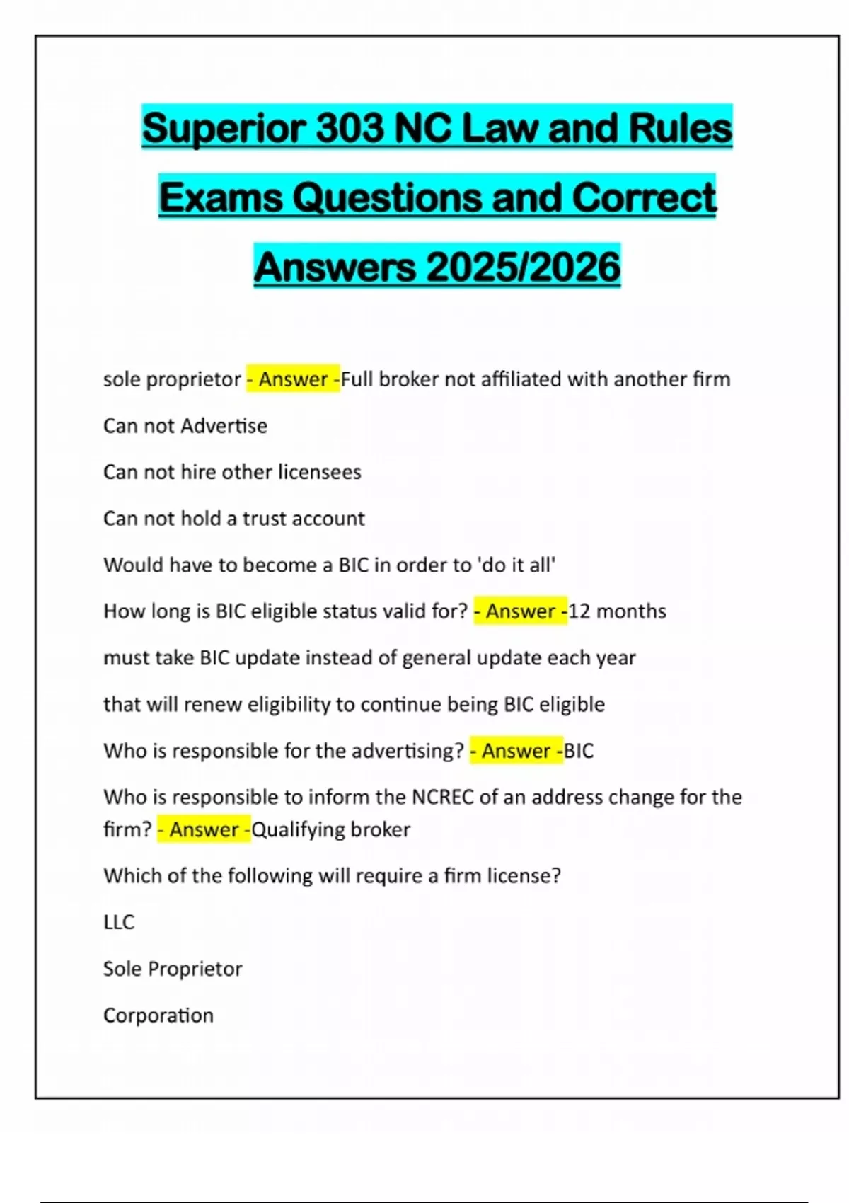 Superior 303 NC Law and Rules Exams Questions and Correct Answers 2025/2026 sole proprietor - Answer -Full broker not affiliated with another firm Can not Advertise Can not hire other licensees Can not hold a trust account Would have to become a BIC in order to 'do it all' How long is BIC eligible status valid for? - Answer -12 months must take BIC update instead of general update each year that will renew eligibility to continue being BIC eligible Who is responsible for the advertising? - Answer -BIC Who is responsible to inform the NCREC of an address change for the firm? - Answer -Qualifying broker Which of the following will require a firm license? LLC Sole Proprietor Corporation