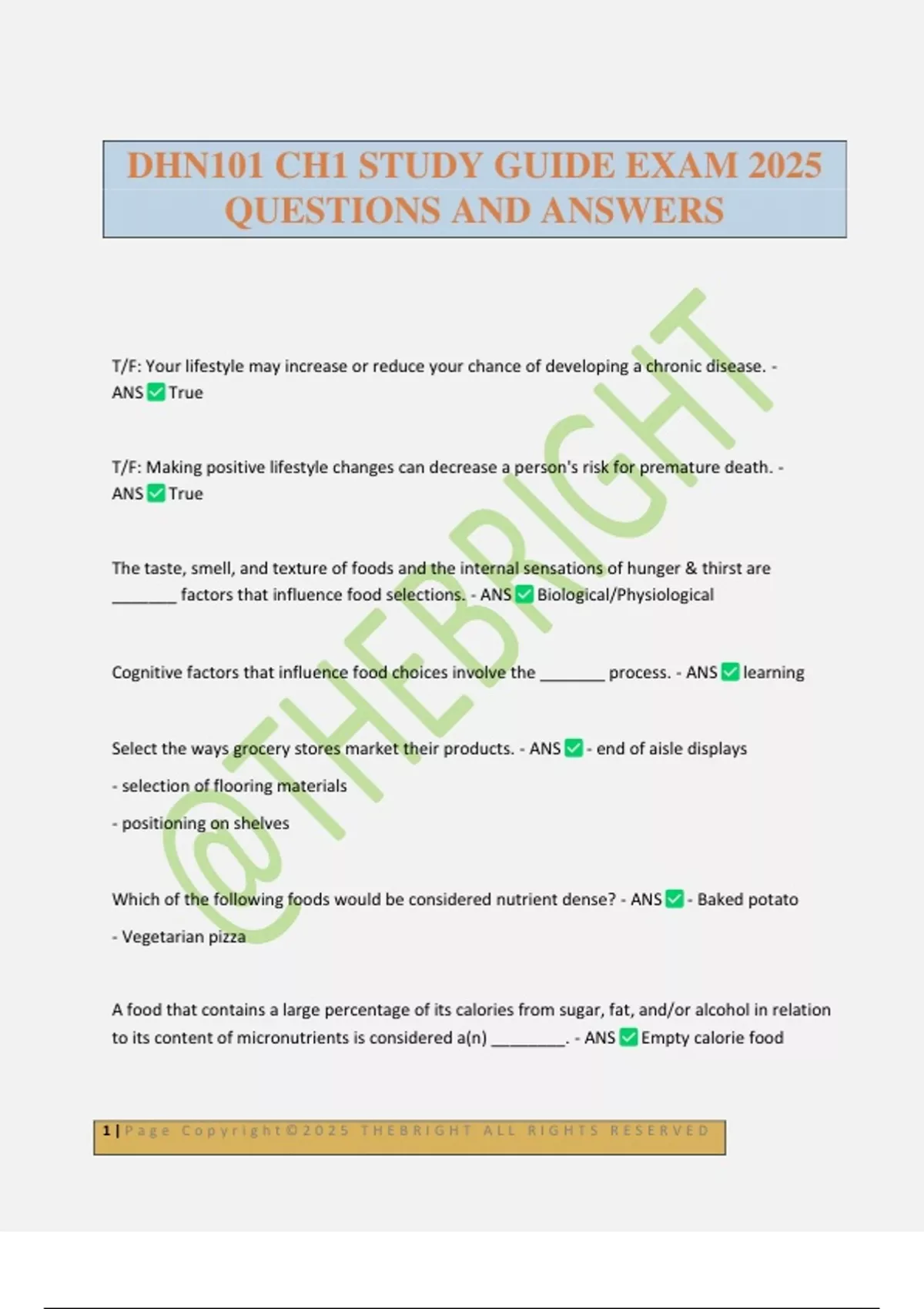 DHN101 CH1 STUDY GUIDE EXAM 2025 QUESTIONS AND ANSWERS T/F: Your lifestyle may increase or reduce your chance of developing a chronic disease. - ANS True T/F: Making positive lifestyle changes can decrease a person's risk for premature death. - ANS True The taste, smell, and texture of foods and the internal sensations of hunger & thirst are _______ factors that influence food selections. - ANS Biological/Physiological Cognitive factors that influence food choices involve the _______ process. - ANS learning Select the ways grocery stores market their products. - ANS - end of aisle displays - selection of flooring materials - positioning on shelves Which of the following foods would be considered nutrient dense? - ANS - Baked potato - Vegetarian pizza A food that contains a large percentage of its calories from sugar, fat, and/or alcohol in relation to its content of micronutrient