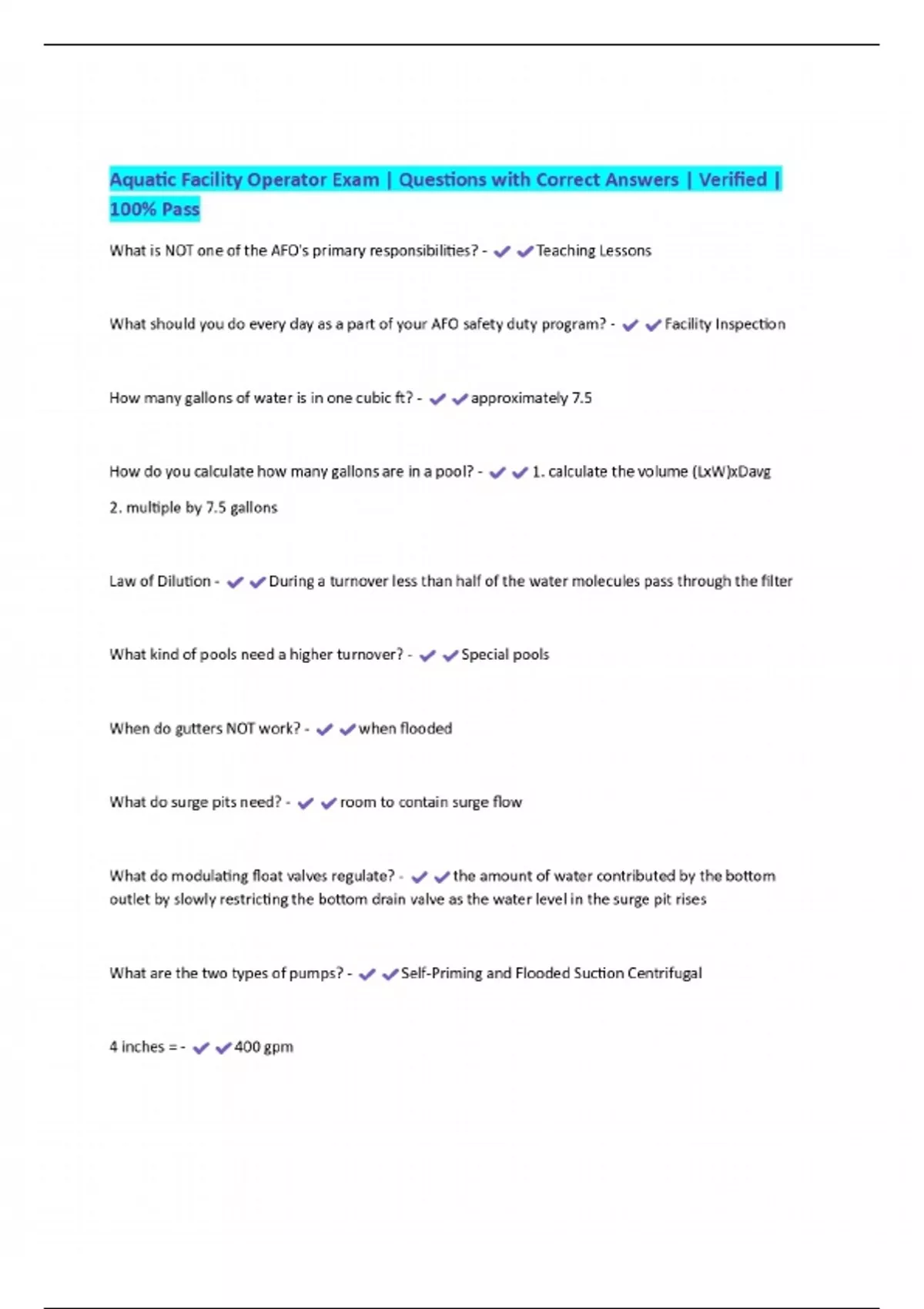 Aquatic Facility Operator Exam | Questions with Correct Answers | Verified | 100% Pass