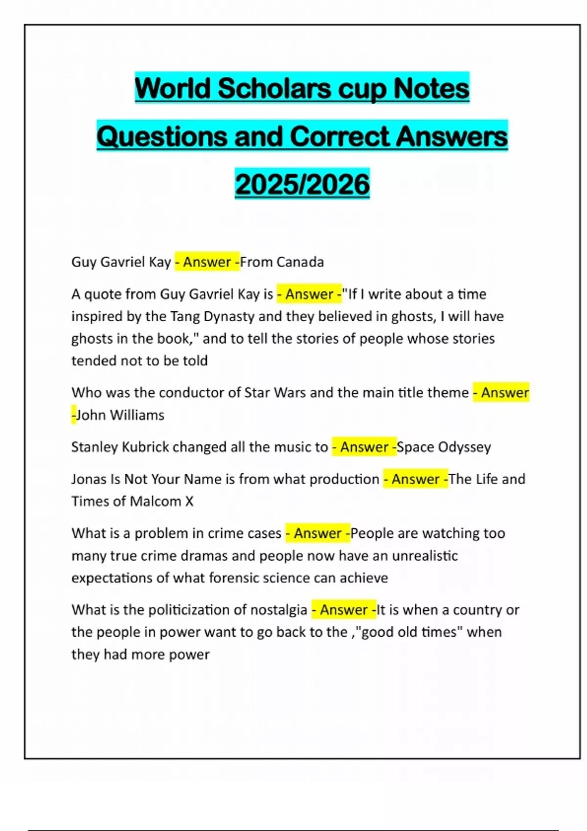 World Scholars cup Notes Questions and Correct Answers 2025/2026 Guy Gavriel Kay - Answer -From Canada A quote from Guy Gavriel Kay is - Answer -"If I write about a time inspired by the Tang Dynasty and they believed in ghosts, I will have ghosts in the book," and to tell the stories of people whose stories tended not to be told Who was the conductor of Star Wars and the main title theme - Answer -John Williams Stanley Kubrick changed all the music to - Answer -Space Odyssey Jonas Is Not Your Name is from what production - Answer -The Life and Times of Malcom X What is a problem in crime cases - Answer -People are watching too many true crime dramas and people now have an unrealistic expectations of what forensic science can achieve What is the politicization of nostalgia - Answer -It is when a country or the people in power want to go back to the ,"good old times" when they had more power