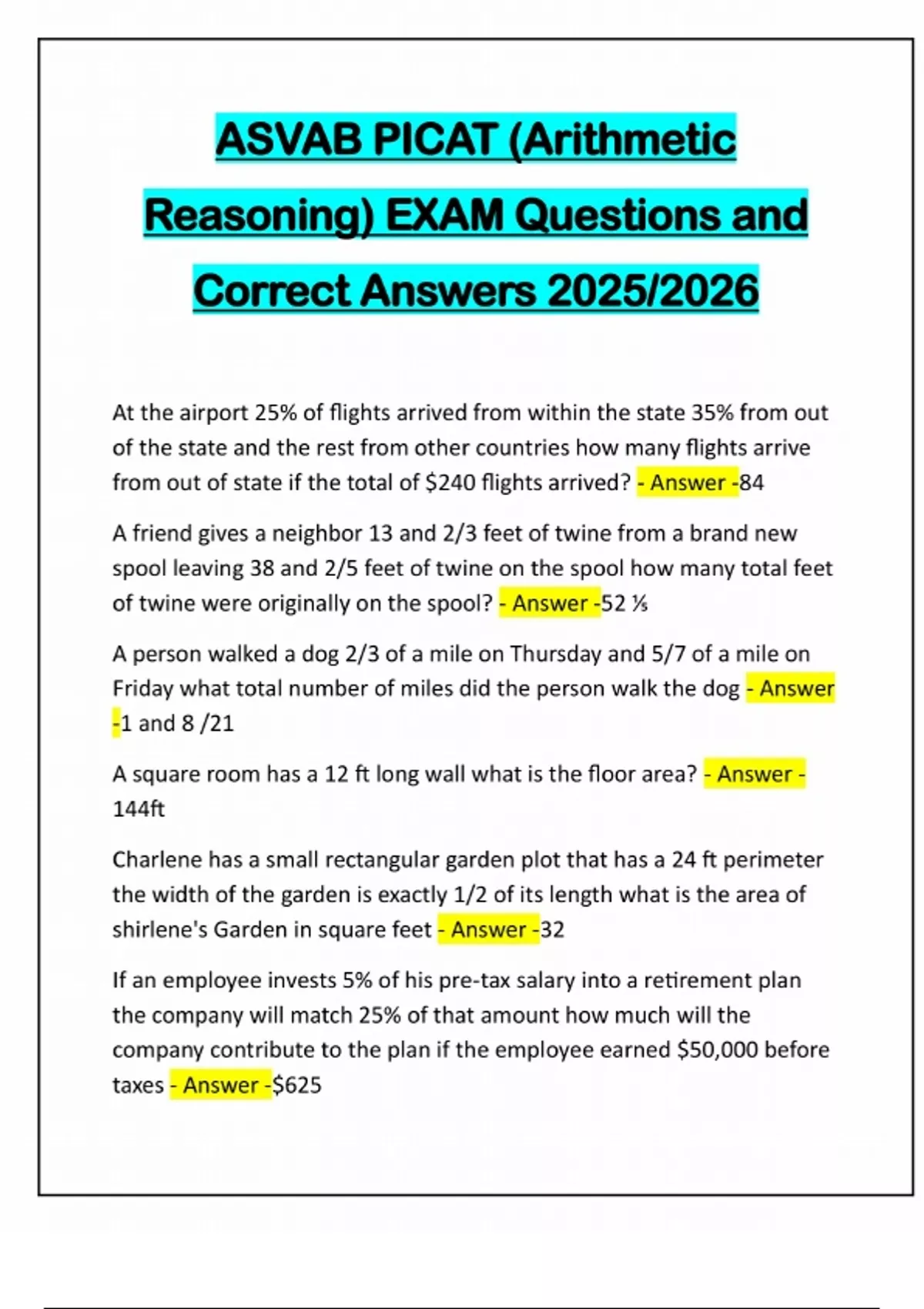 ASVAB PICAT (Arithmetic Reasoning) EXAM Questions and Correct Answers 2025/2026 At the airport 25% of flights arrived from within the state 35% from out of the state and the rest from other countries how many flights arrive from out of state if the total of $240 flights arrived? - Answer -84 A friend gives a neighbor 13 and 2/3 feet of twine from a brand new spool leaving 38 and 2/5 feet of twine on the spool how many total feet of twine were originally on the spool? - Answer -52 ⅕ A person walked a dog 2/3 of a mile on Thursday and 5/7 of a mile on Friday what total number of miles did the person walk the dog - Answer -1 and 8 /21 A square room has a 12 ft long wall what is the floor area? - Answer - 144ft Charlene has a small rectangular garden plot that has a 24 ft perimeter the width of the garden is exactly 1/2