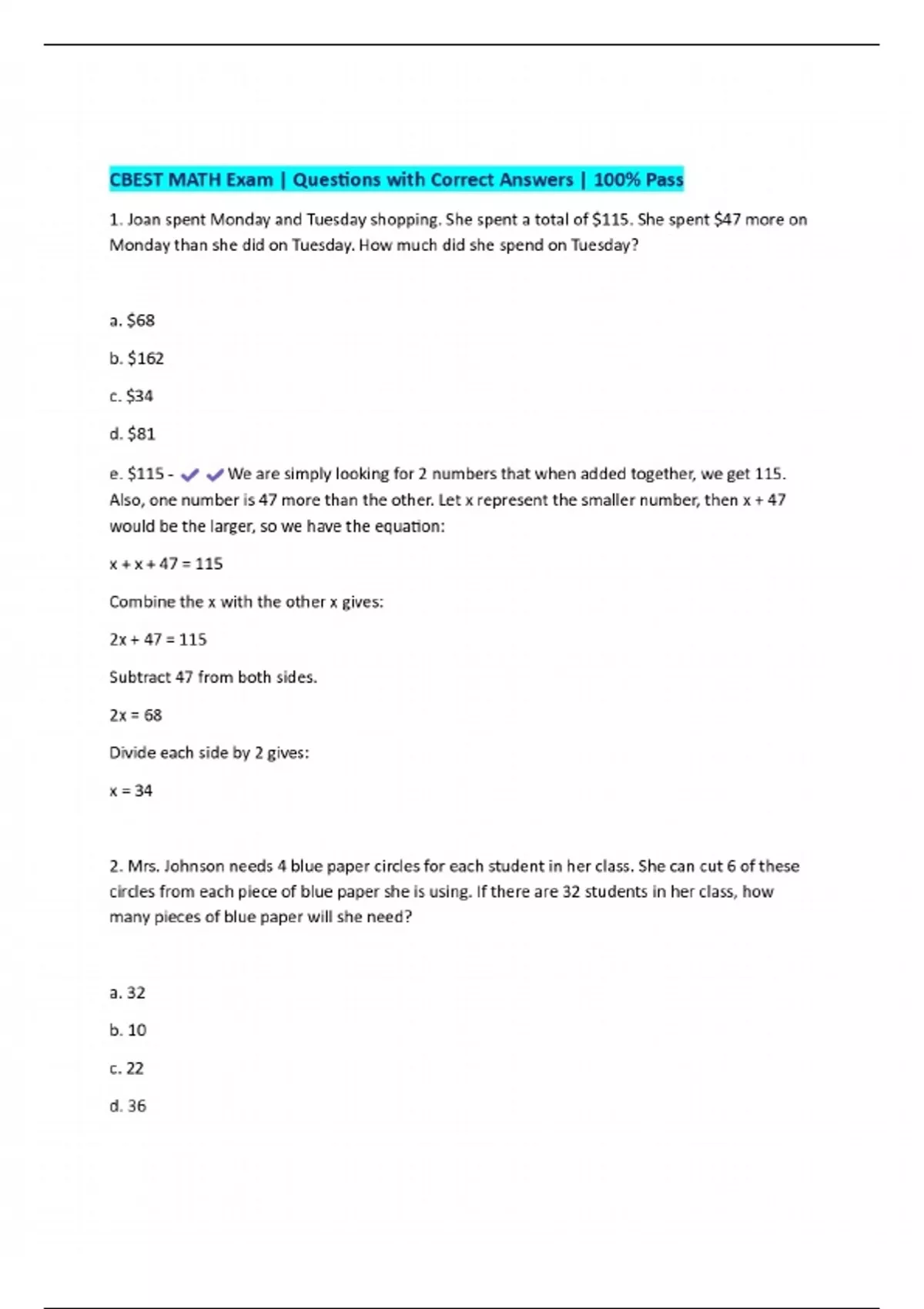 cbest math exam questions with correct answers