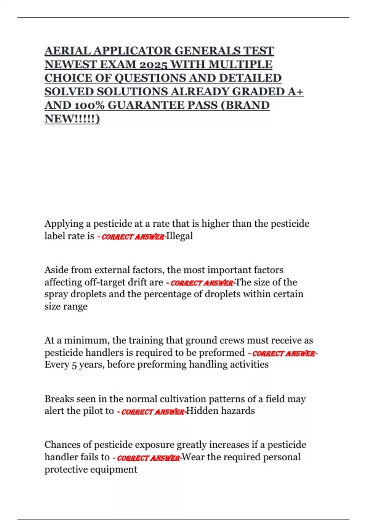 AERIAL APPLICATOR GENERALS TEST NEWEST EXAM 2025 WITH MULTIPLE CHOICE OF QUESTIONS AND DETAILED SOLVED SOLUTIONS ALREADY GRADED A+ AND 100% GUARANTEE PASS (BRAND NEW!!!!!)