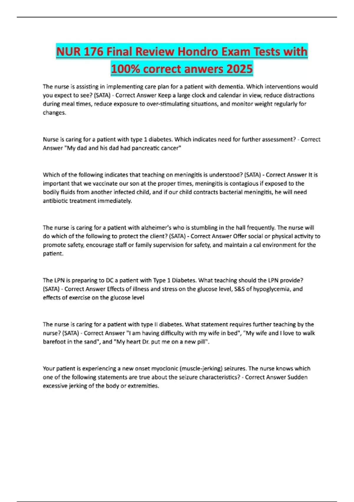 NUR 176 Final Review Hondro Exam Tests with 100% correct anwers 2025 The nurse is assisting in implementing care plan for a patient with dementia. Which interventions would you expect to see? (SATA) - Correct Answer Keep a large clock and calendar in view, reduce distractions during meal times, reduce exposure to over-stimulating situations, and monitor weight regularly for changes. Nurse is caring for a patient with type 1 diabetes. Which indicates need for further assessment? - Correct Answer "My dad and his dad had pancreatic cancer" Which of the following indicates that teaching on meningitis is understood? (SATA) - Correct Answer It is important that we vaccinate our son at the proper times, meningitis is contagious if exposed to the bodily fluids from another infected child, and if our child contracts bacterial meningitis, he will need antibiotic treatment immediately. The nurse is caring for a patient with alzheimer's who is stumbling in the hall frequently. The nurse will do which of the following to protect the client? (SATA) - Correct Answer Offer social or physical activity to promote safety, encourage staff or family supervision for safety, and maintain a cal environment for the patient. The LPN is preparing to DC a patient with Type 1 Diabetes. What teaching should the LPN provide? (SATA) - Correct Answer Effects of illness and stress on the glucose level, S&S of hypoglycemia, and effects of exercise on the glucose level The nurse is caring for a patient with type II diabetes. What statement requires further teaching by the nurse? (SATA) - Correct Answer "I am having difficulty with my wife in bed", "My wife and I love to walk barefoot in the sand", and "My heart Dr. put me on a new pill". Your patient is experiencing a new onset myoclonic (muscle-jerking) seizures. The nurse knows which one of the following statements are true about the seizure characteristics? - Correct Answer Sudden excessive jerking of the body or extremities.