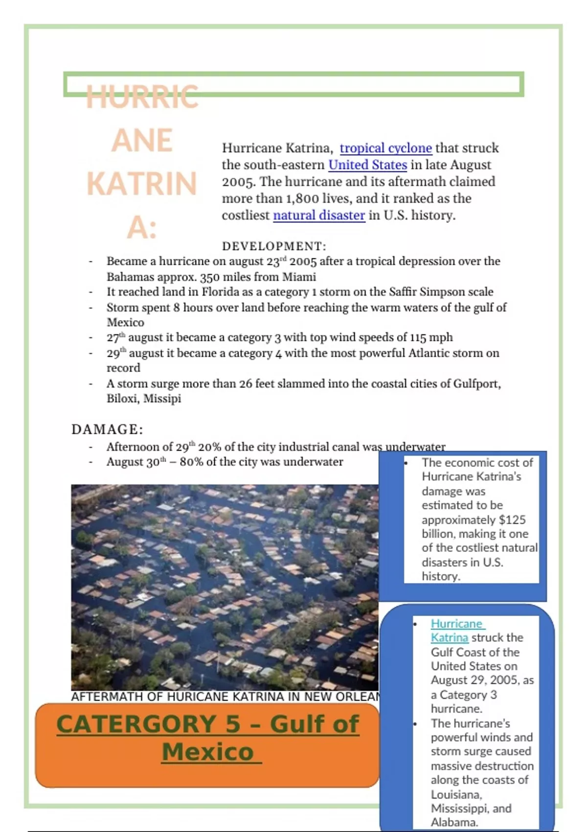 - August 30th – 80% of the city was underwater The economic cost of