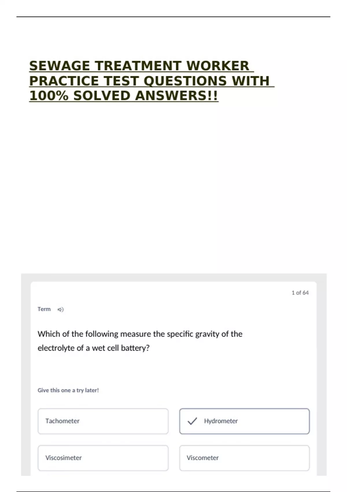 SEWAGE TREATMENT WORKER PRACTICE TEST QUESTIONS WITH 100% SOLVED ANSWERS!!