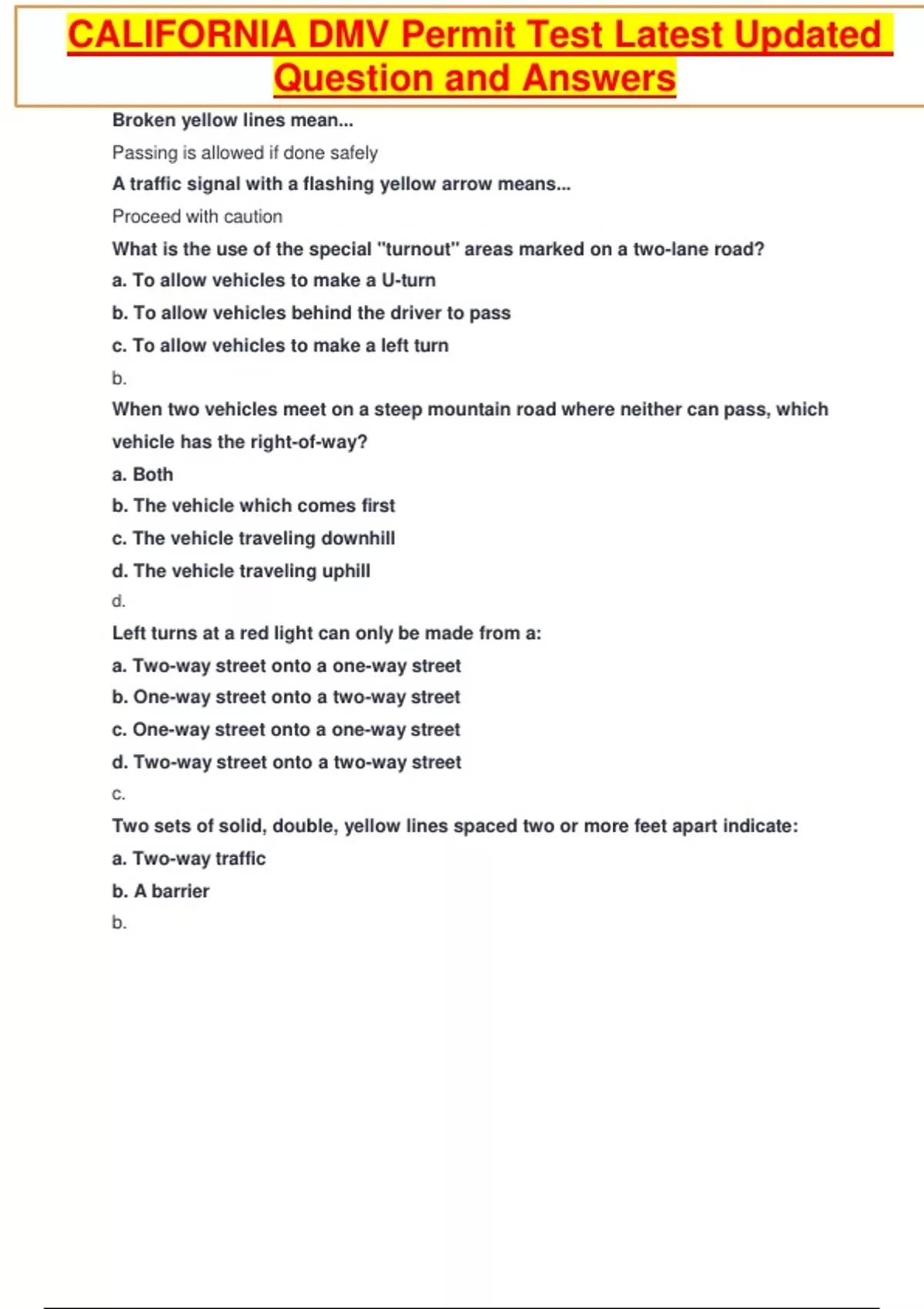 CALIFORNIA DMV Permit Test Latest Updated