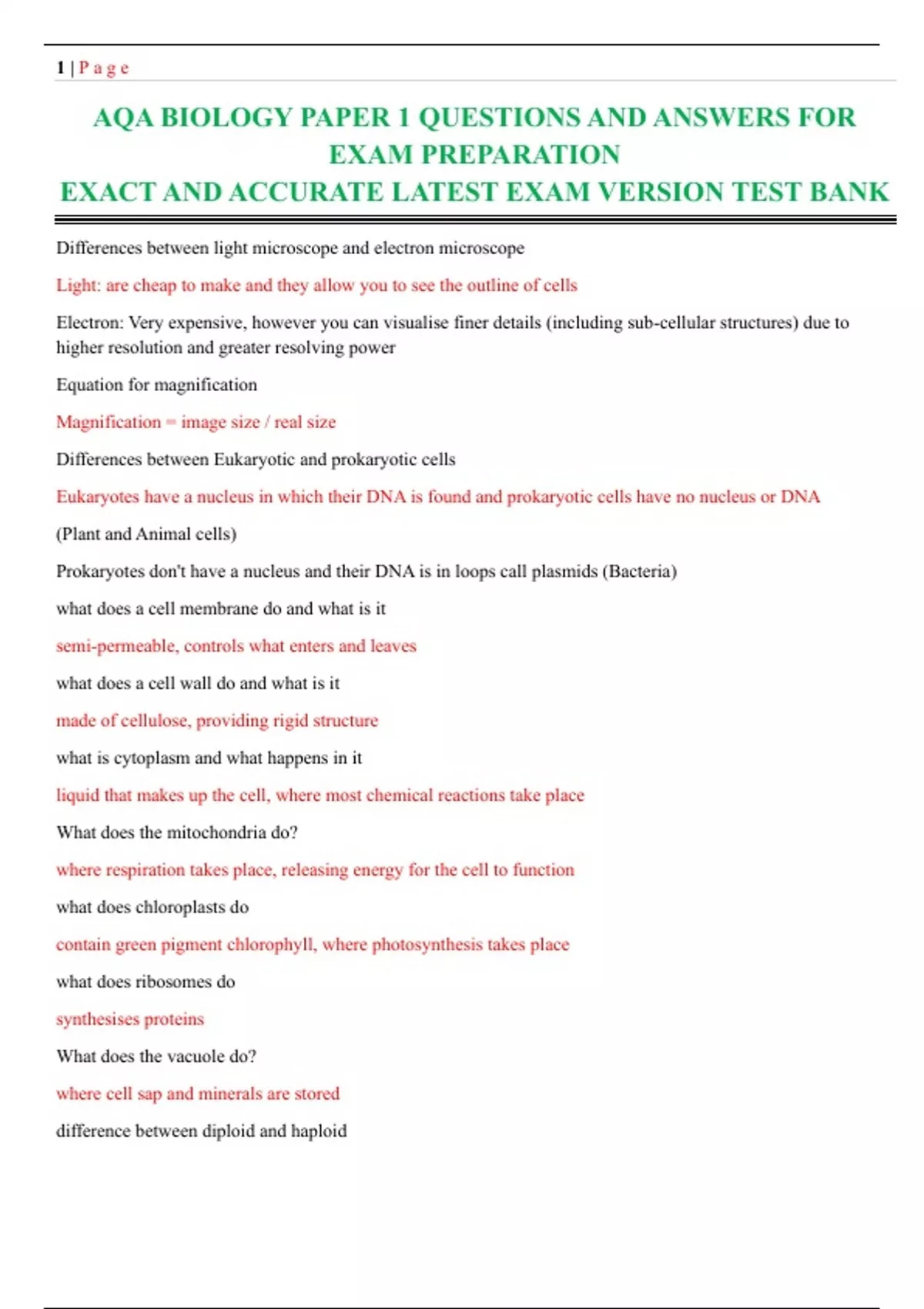 AQA BIOLOGY PAPER 1 QUESTIONS AND ANSWERS FOR EXAM PREPARATION EXACT AND ACCURATE LATEST EXAM VERSION TEST BANK