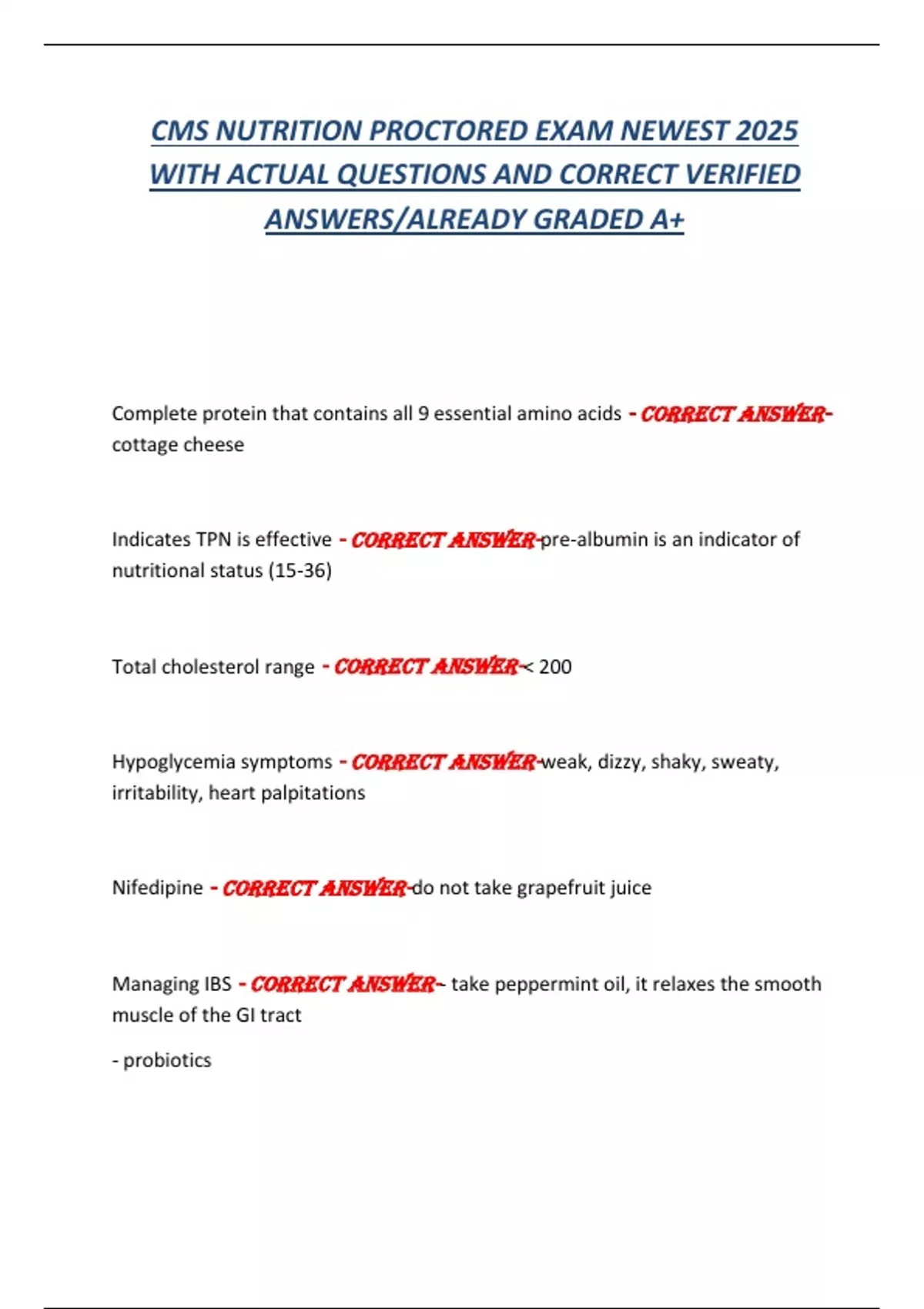 CMS NUTRITION PROCTORED EXAM NEWEST 2025 WITH ACTUAL QUESTIONS AND CORRECT VERIFIED ANSWERS/ALREADY GRADED A+