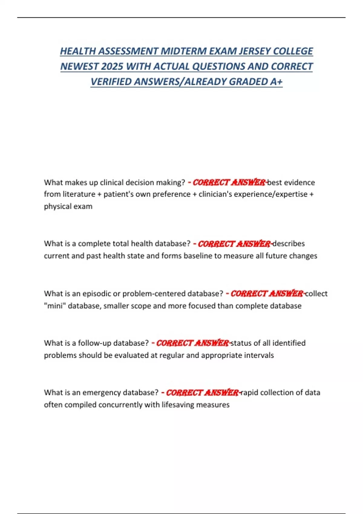 HEALTH ASSESSMENT MIDTERM EXAM JERSEY COLLEGE NEWEST 2025 WITH ACTUAL QUESTIONS AND CORRECT VERIFIED ANSWERS/ALREADY GRADED A+