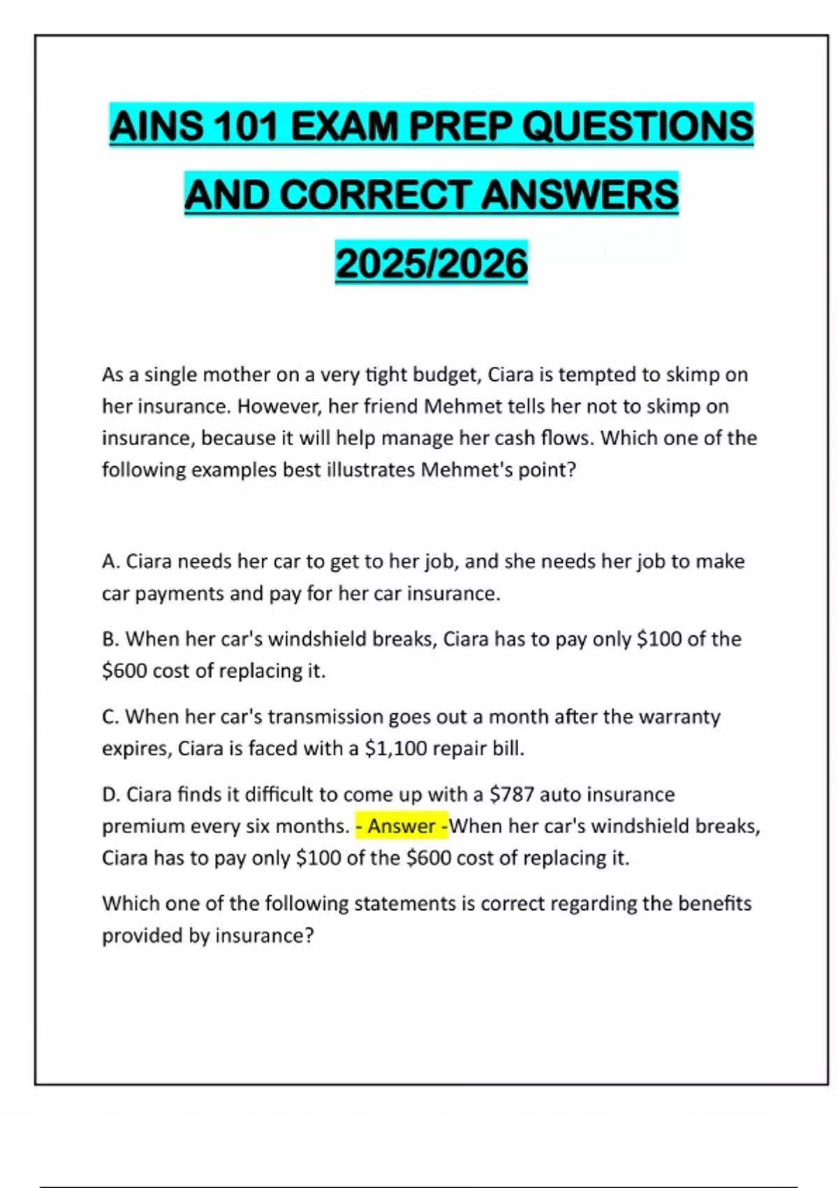 AINS 101 EXAM PREP QUESTIONS AND CORRECT ANSWERS 2025/2026 As a single mother on a very tight budget, Ciara is tempted to skimp on her insurance. However, her friend Mehmet tells her not to skimp on insurance, because it will help manage her cash flows. Which one of the following examples best illustrates Mehmet's point? A. Ciara needs her car to get to her job, and she needs her job to make car payments and pay for her car insurance. B. When her car's windshield breaks, Ciara has to pay only $100 of the $600 cost of replacing it. C. When her car's transmission goes out a month after the warranty expires, Ciara is faced with a $1,100 repair bill. D. Ciara finds it difficult to come up with a $787 auto insurance premium every six months. - Answer -When her car's windshield breaks, Ciara has to pay only $100 of the $600 cost of replacing it. Which one of the following statements is correct regarding the benefits provided by insurance?A. Insurance reduces the financial consequences of loss exposures but not the related uncertainty. B. The primary role of insurance is to meet mandatory insurance requirements. C. The reduction in losses paid by insurers due to risk control measures benefits individual insureds but not society as a whole. D. Insurance helps reduce the financial burden to society by compensating accident victims. - Answer -Insurance helps reduce the financial burden to society by compensating accident victims. Shelton Industries experienced a fire in its manufacturing plant. Several employees suffered burns and smoke inhalation injuries as they tried to escape the building. Which one of Shelton Industries' commercial property-casualty policies would pay for the employees' injuries and illnesses? - Answer -Workers compensation insurance A homeowners policy is a type of - Answer -Personal property-casualty insurance policy. Which one of the following correctly describes a reason for government involvement in property-casualty insurance? A. Selling insurance provides the government with a non-tax source of revenues and profits. B. Government programs can meet legitimate public demands unmet by private insurers.C. Competition from government plans keeps private insurer's premiums competitive. D. Preventing high-risk individuals or activities from being insured is in the public interest. - Answer -Government programs can meet legitimate public demands unmet by private insurers. Insurance Company wrote a commercial liability policy for a manufacturer of off-road motorcycles. The potential costs of the insured's loss exposure exceed Insurance Company's capacity. Insurance Company could consider which one of the following types of contractual transferring agreement to meet its needs? - Answer - Reinsurance In an effort to reduce expenses, increase profitability, and reduce human errors; ABC Insurance Company decided to automate most of its personal lines underwriting function. The company now uses standardized application forms that are submitted electronically to one of the company's regional offices. At each regional office, a computer with a scanner reads the applications. The computer has been programmed with acceptable answers to the questions. If the answers on the application are all acceptable, the policy is automatically issued. Rejected applications are automatically forwarded to a human underwriter who reviews them. The use of this technology has reduced the company's expense ratio by two and a half percent, and reduced the time it takes to issue a policy. ABC Insurance Company's use of computers to evaluate applications electronically is an application of A. Radiant sensors