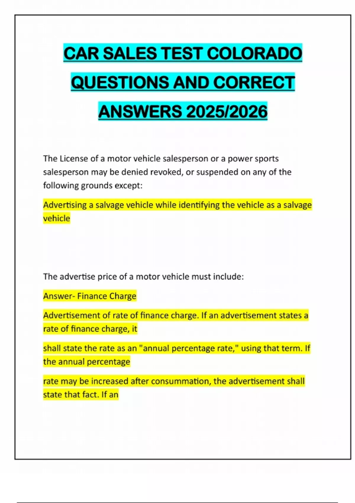 CAR SALES TEST COLORADO QUESTIONS AND CORRECT ANSWERS 2025/2026 The License of a motor vehicle salesperson or a power sports salesperson may be denied revoked, or suspended on any of the following grounds except: Advertising a salvage vehicle while identifying the vehicle as a salvage vehicle The advertise price of a motor vehicle must include: Answer- Finance Charge Advertisement of rate of finance charge. If an advertisement states a rate of finance charge, it shall state the rate as an "annual percentage rate," using that term. If the annual percentage rate may be increased after consummation, the advertisement shall state that fact. If anadvertisement is for credit not secured by a dwelling, the advertisement shall not state any other rate, except that a simple annual rate or periodic rate that is applied to an unpaid balance may be stated in conjunction with, but not more conspicuously than, the annual percentage rate. If an advertisement is for credit secured by a dwelling, the advertisement shall not state any other rate, except that a simple annual rate that is applied to an unpaid balance may be stated in conjunction with, but not more conspicuously than, the annual percentage rate. Advertisement of terms that require additional disclosures - Triggering terms. If any of the following terms is set forth in an advertisement, the advertisement shall meet the requirements of paragraph (d)(2) of this section: (i) The amount or percentage of any downpayment. (ii) The number of payments or period of repayment. (iii)The amount of any payment. (iv) The amount of any finance charge. Which of the following is a true statement regarding dealers and buyers a dealer shall clearly indicate on the customer contract when a vehicle is sold "as-is and without a garantee Which of the following is not proof of ownership of a motor vehicle for a Colorado dealer Answer- A vehicle subject to lien on the title 2.0 Proof of Ownership Requirements a. A used vehicle with a Colorado title: 2.1 All Colorado dealers or wholesalers must maintain the following evidence of ownership for each