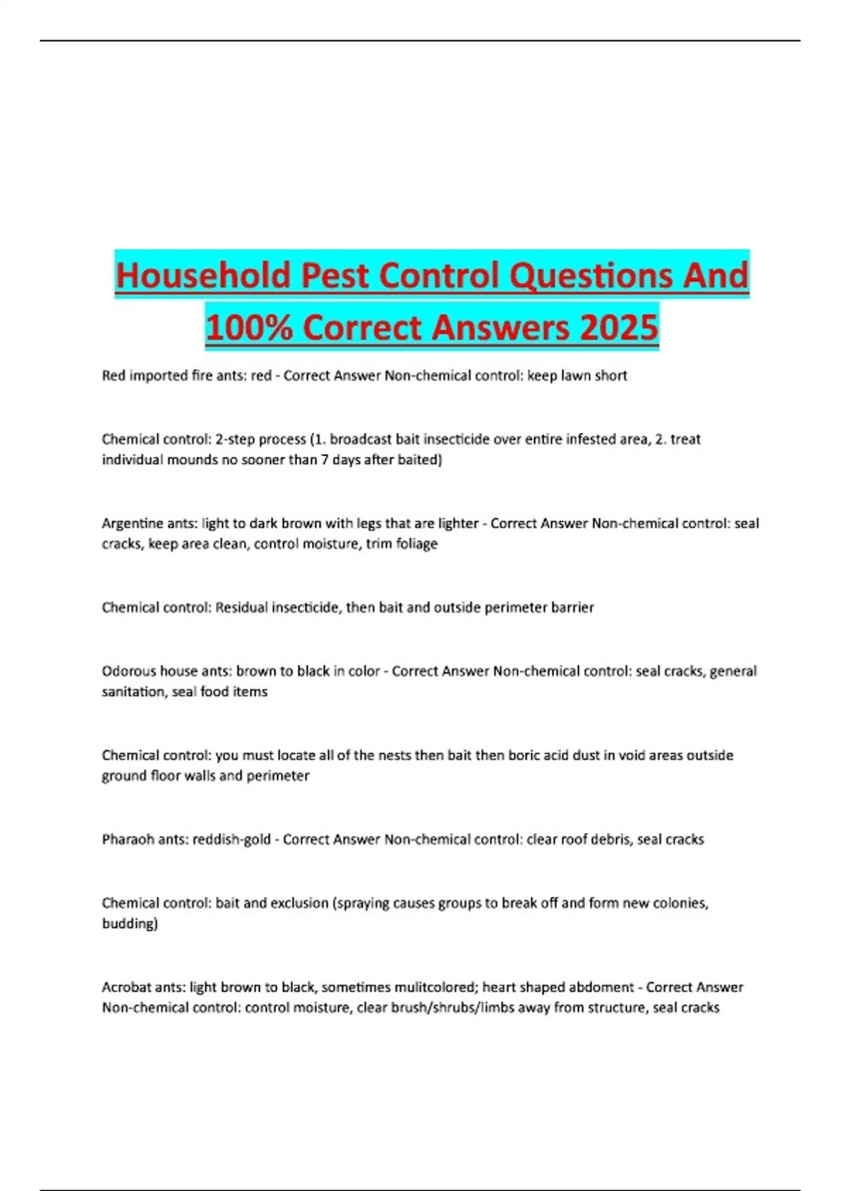 Household Pest Control Questions And 100% Correct Answers 2025 Red imported fire ants: red - Correct Answer Non-chemical control: keep lawn short Chemical control: 2-step process (1. broadcast bait insecticide over entire infested area, 2. treat individual mounds no sooner than 7 days after baited) Argentine ants: light to dark brown with legs that are lighter - Correct Answer Non-chemical control: seal cracks, keep area clean, control moisture, trim foliage Chemical control: Residual insecticide, then bait and outside perimeter barrier Odorous house ants: brown to black in color - Correct Answer Non-chemical control: seal cracks, general sanitation, seal food items Chemical control: you must locate all of the nests then bait then boric acid dust in void areas outside ground floor walls and perimeter Pharaoh ants: reddish-gold - Correct Answer Non-chemical control: clear roof debris, seal cracks Chemical control: bait and exclusion (spraying causes groups to break off and form new colonies, budding) Acrobat ants: light brown to black, sometimes mulitcolored; heart shaped abdoment - Correct Answer Non-chemical control: control moisture, clear brush/shrubs/limbs away from structure, seal cracks