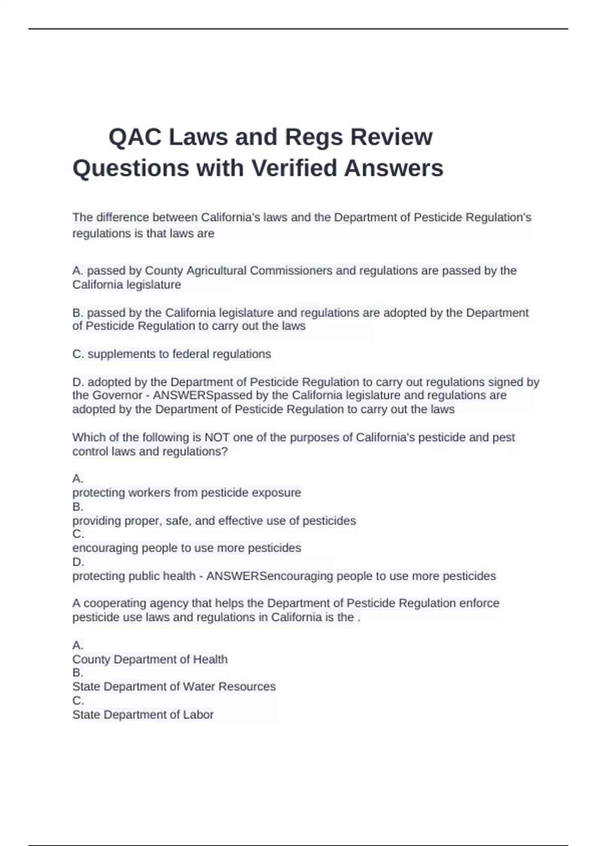 The difference between California's laws and the Department of Pesticide Regulation's regulations is that laws are A. passed by County Agricultural Commissioners and regulations are passed by the California legislature B. passed by the California legislature and regulations are adopted by the Department of Pesticide Regulation to carry out the laws C. supplements to federal regulations D. adopted by the Department of Pesticide Regulation to carry out regulations signed by the Governor - ANSWERSpassed by the California legislature and regulations are adopted by the Department of Pesticide Regulation to carry out the laws Which of the following is NOT one of the purposes of California's pesticide and pest control laws and regulations? A. protecting workers from pesticide exposure B. providing proper, safe, and effective use of pesticides C. encouraging people to use more pesticides D. protecting public health - ANSWERSencouraging people to use more pesticides A cooperating agency that helps the Department of Pesticide Regulation enforce pesticide use laws and regulations in California is the . A. County Department of Health B. State Department of Water Resources C. State Department of Labor D. County Agricultural Commissioner - ANSWERSCounty Agricultural Commissioner County Agricultural Commissioners may adopt supplemental pesticide regulations with the approval of the . A. Department of Pesticide Regulation B. Office of the Governor C. County Board of Supervisors D. California State Legislature - ANSWERSDepartment of Pesticide Regulation Which of the following is considered to be pesticide labeling? A. spray nozzle catalog B. a printed pesticide advertisement C. the federal Worker Protection Standard D. a written recommendation - ANSWERS. a written recommendation When a Pesticide Registrant allows a pesticide product registration to lapse, Pest Control Dealers . A. must immediately return all unsold stock B. can sell and deliver the pesticide product for two years C. must retrieve all previously sold stock D. can indefinitely sell and deliver the pesticide product - ANSWERScan sell and deliver the pesticide product for two years When a pesticide product registration is cancelled, the sale and use of this product . A. is automatically prohibited under all circumstances B. may continue under conditions imposed by the regulatory agency responsible for the cancellation C. will be allowed for two years from the cancellation date D. is not affected as long as detailed sales records are kept current - ANSWERS. may continue under conditions imposed by the regulatory agency responsible for the cancellation A Special Local Need registration (SLN) allows . A. growers to apply the pesticide to any crop as long as the Special Local Need is valid in the grower's state B. supplemental uses of the pesticide uniformly throughout the U.S. C. uses of pesticides for crops or sites not listed on the Section 3 labeling in the state it was issued D. any feasible use of the pesticide in the specified local area - ANSWERSuses of pesticides for crops or sites not listed on the Section 3 labeling in the state it was issued Which of the following is considered a labeling booklet? A. sales literature distributed by the Pesticide Registrant B. a sample of pesticide labeling produced by the Pesticide Registrant C. literature containing use and maintenance directions for application equipment D. a pamphlet containing use directions and restrictions that is attached to the container - ANSWERSa pamphlet containing use directions and restrictions that is attached to the container On pesticide labeling the signal word A. signifies the relative acute toxicity of the pesticide product B. identifies the formulation of pesticide product C. warns of the potential crop damage level D. identifies relative effectiveness or control level - ANSWERSsignifies the relative acute toxicity of the pesticide product