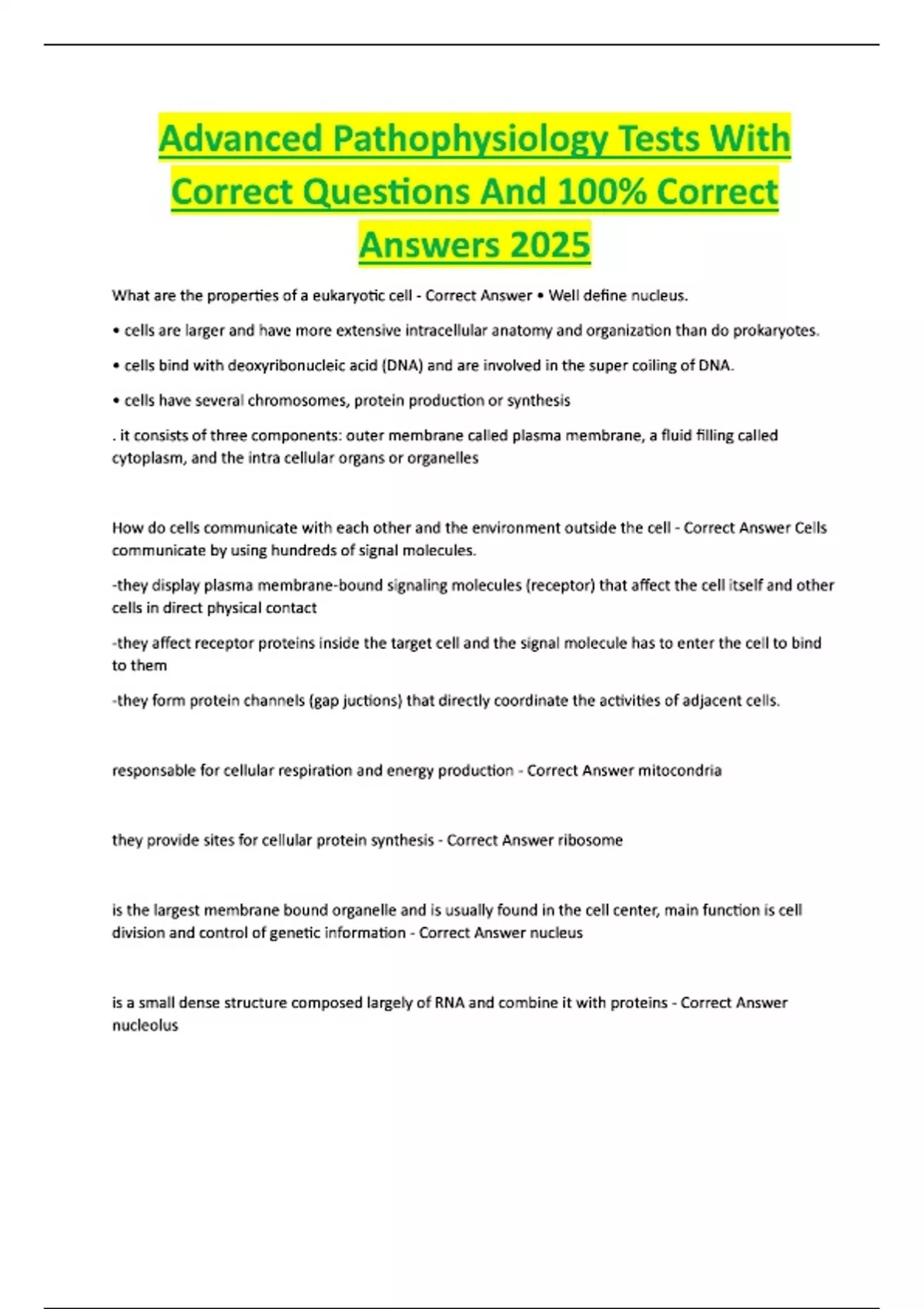 Advanced Pathophysiology Tests With Correct Questions And 100% Correct Answers 2025 What are the properties of a eukaryotic cell - Correct Answer • Well define nucleus. • cells are larger and have more extensive intracellular anatomy and organization than do prokaryotes. • cells bind with deoxyribonucleic acid (DNA) and are involved in the super coiling of DNA. • cells have several chromosomes, protein production or synthesis . it consists of three components: outer membrane called plasma membrane, a fluid filling called cytoplasm, and the intra cellular organs or organelles How do cells communicate with each other and the environment outside the cell - Correct Answer Cells communicate by using hundreds of signal molecules. -they display plasma membrane-bound signaling molecules (receptor) that affect the cell itself and other cells in direct physical contact -they affect receptor proteins inside the target cell and the signal molecule has to enter the cell to bind to them -they form protein channels (gap juctions) that directly coordinate the activities of adjacent cells. responsable for cellular respiration and energy production - Correct Answer mitocondria they provide sites for cellular protein synthesis - Correct Answer ribosome is the largest membrane bound organelle and is usually found in the cell center, main function is cell division and control of genetic information - Correct Answer nucleus is a small dense structure composed largely of RNA and combine it with proteins - Correct Answer nucleolus