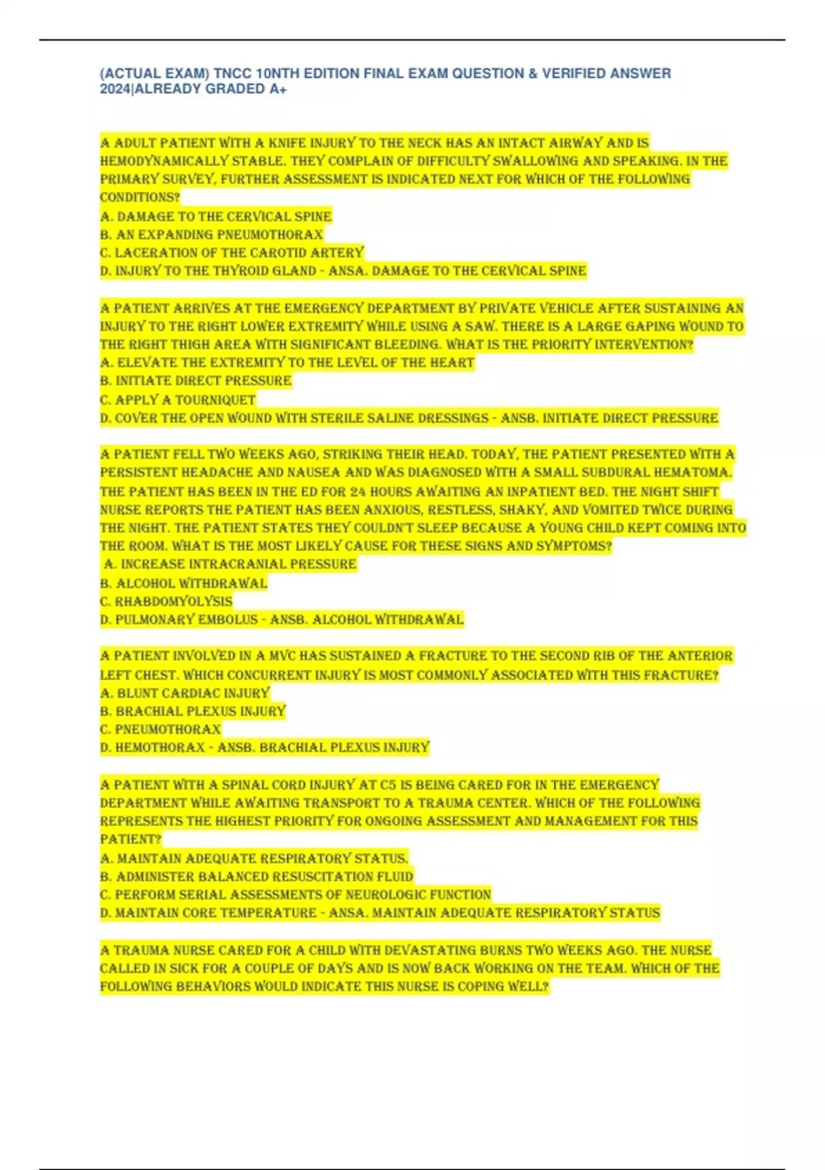 ,(ACTUAL EXAM) TNCC 10NTH EDITION FINAL EXAM QUESTION & VERIFIED ANSWER