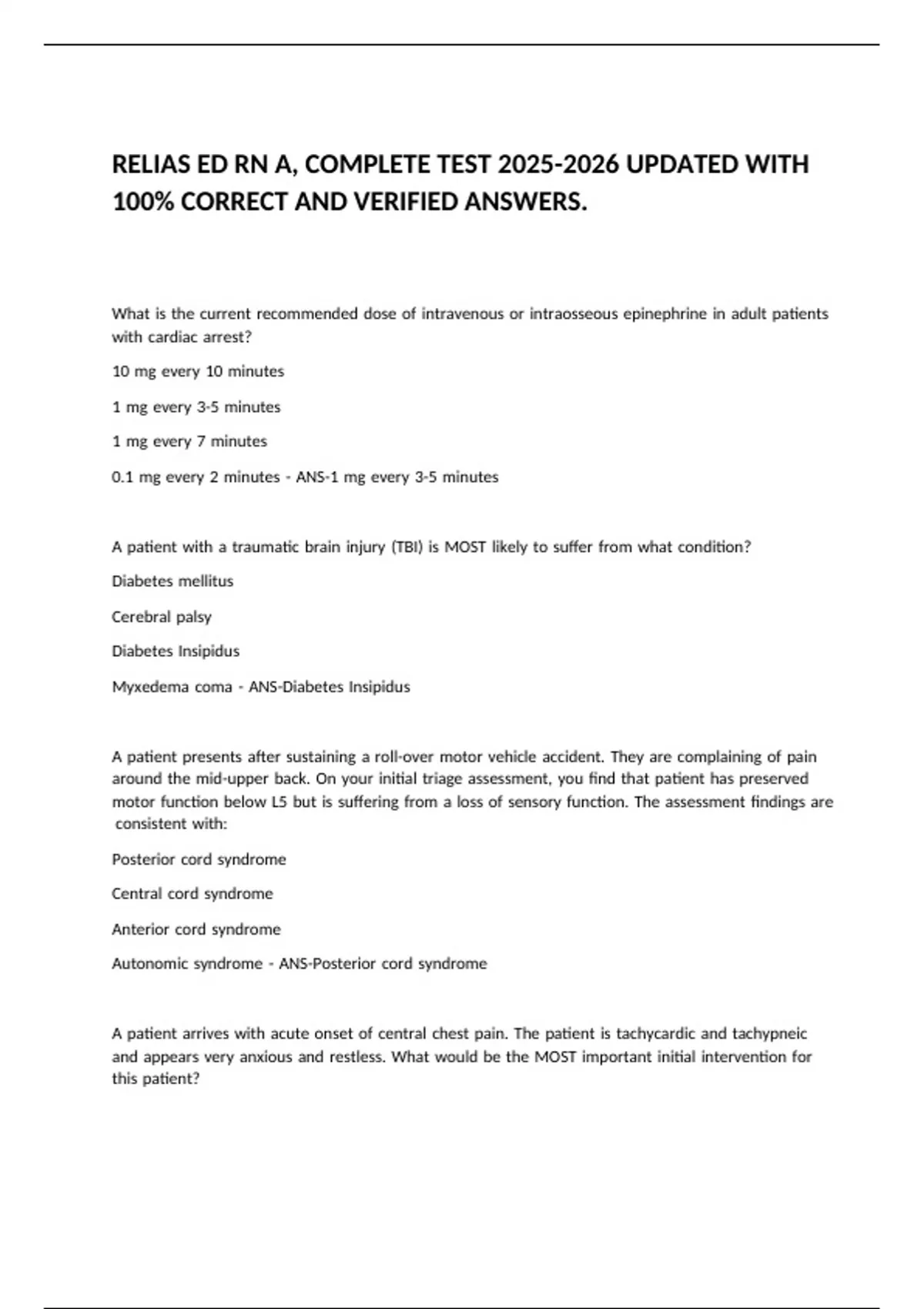 RELIAS ED RN A, COMPLETE TEST UPDATED WITH 100% CORRECT AND VERIFIED ANSWERS.