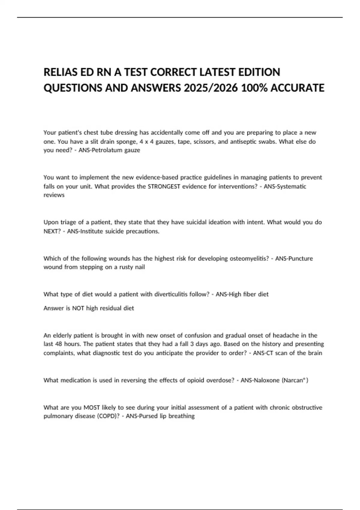RELIAS ED RN A TEST CORRECT LATEST EDITION QUESTIONS AND ANSWERS 2025/2026 100% ACCURATE