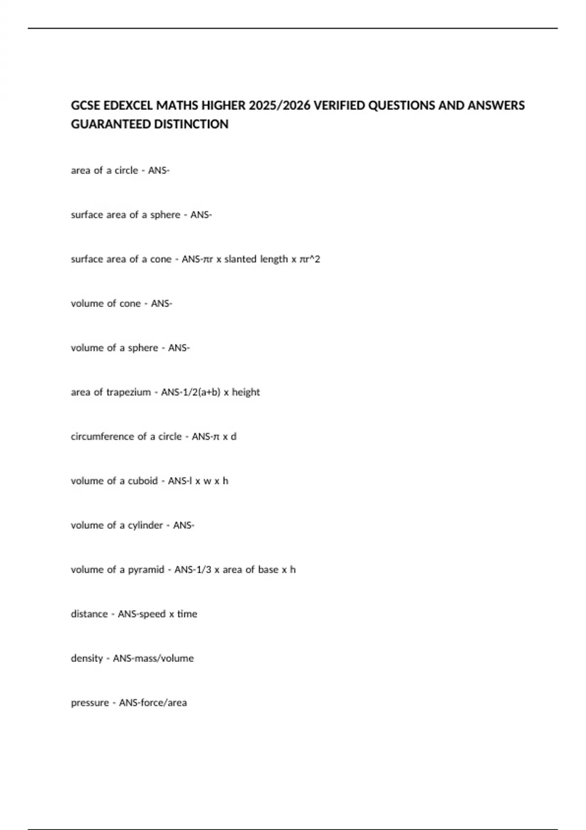 GCSE EDEXCEL MATHS HIGHER 2025/2026 VERIFIED QUESTIONS AND ANSWERS GUARANTEED DISTINCTION