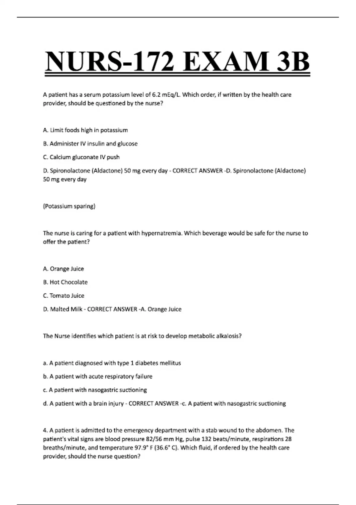 NURS-172 EXAM 3B A patient has a serum potassium level of 6.2 mEq/L. Which order, if written by the health care provider, should be questioned by the nurse? A. Limit foods high in potassium B. Administer IV insulin and glucose C. Calcium gluconate IV push D. Spironolactone (Aldactone) 50 mg every day - CORRECT ANSWER -D. Spironolactone (Aldactone) 50 mg every day (Potassium sparing) The nurse is caring for a patient with hypernatremia. Which beverage would be safe for the nurse to offer the patient? A. Orange Juice B. Hot Chocolate C. Tomato Juice D. Malted Milk - CORRECT ANSWER -A. Orange Juice The Nurse identifies which patient is at risk to develop metabolic alkalosis? a. A patient diagnosed with type 1 diabetes mellitus b. A patient with acute respiratory failure c. A patient with nasogastric suctioning d. A patient with a brain injury - CORRECT ANSWER -c. A patient with nasogastric suctioning 4. A patient is admitted to the emergency department with a stab wound to the abdomen. The patient's vital signs are blood pressure 82/56 mm Hg, pulse 132 beats/minute, respirations 28 breaths/minute, and temperature 97.9° F (36.6° C). Which fluid, if ordered by the health care provider, should the nurse question? a. Lactated Ringer's solution b. 3% saline c. 0.45% saline d. 0.9% saline - CORRECT ANSWER -c. 0.45% saline