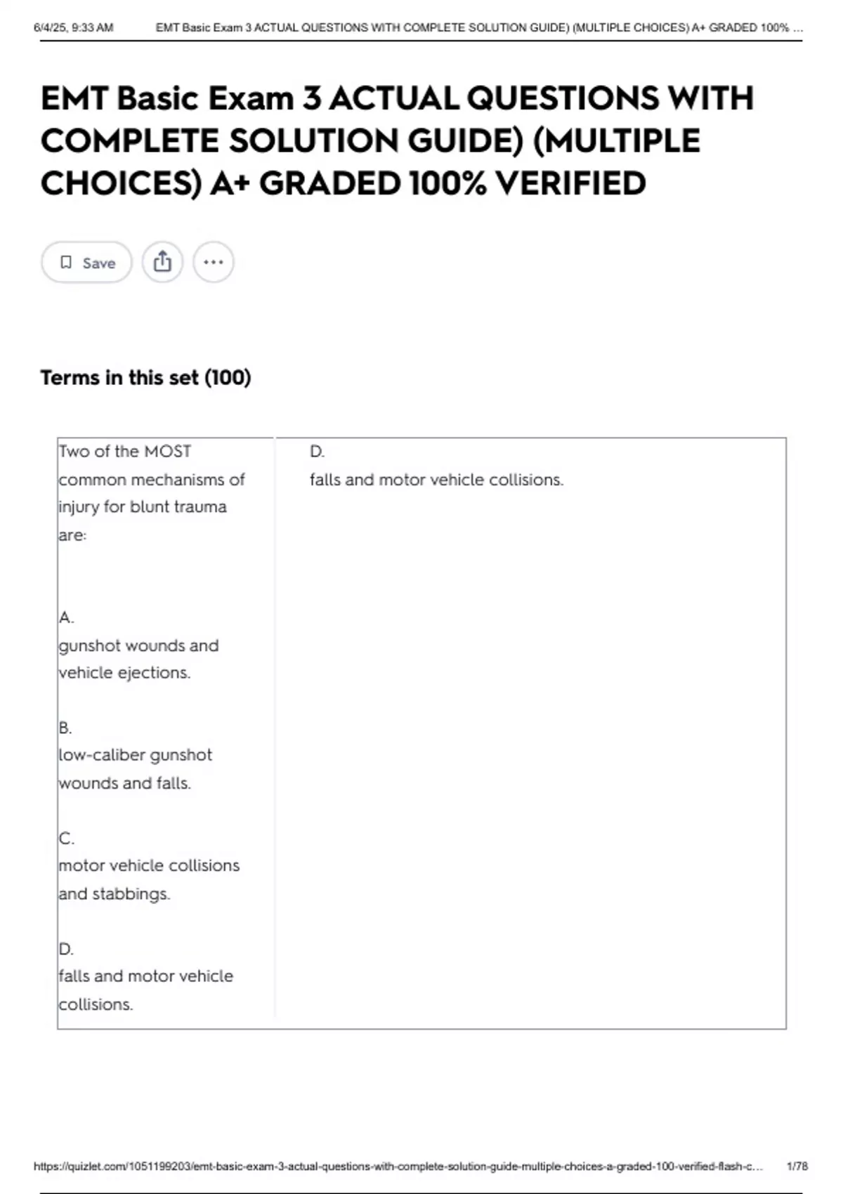 , 6/4/25, 9:33 AM EMT Basic Exam 3 ACTUAL QUESTIONS WITH COMPLETE SOLUTION GUIDE) (MULTIPLE CHOICES) A+ GRADED 100% …