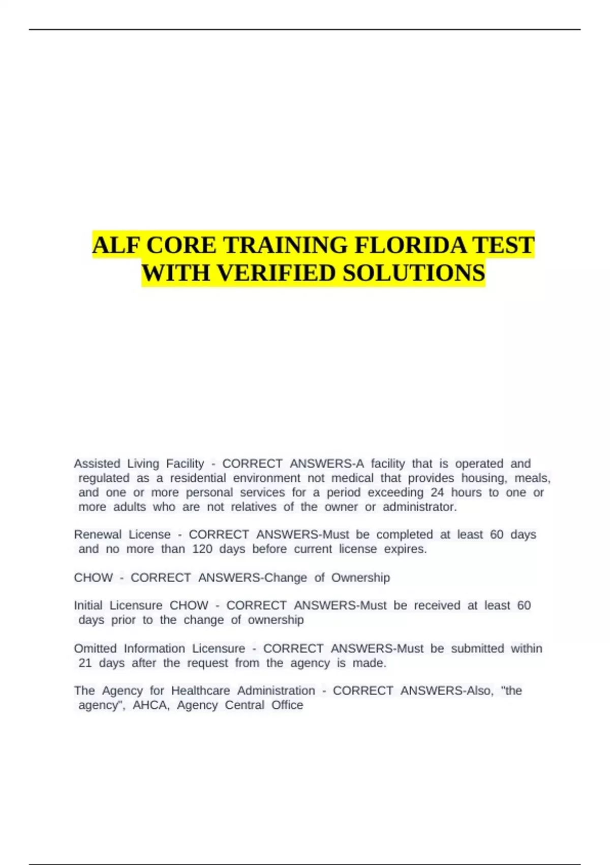 ALF CORE TRAINING FLORIDA TEST WITH VERIFIED SOLUTIONS