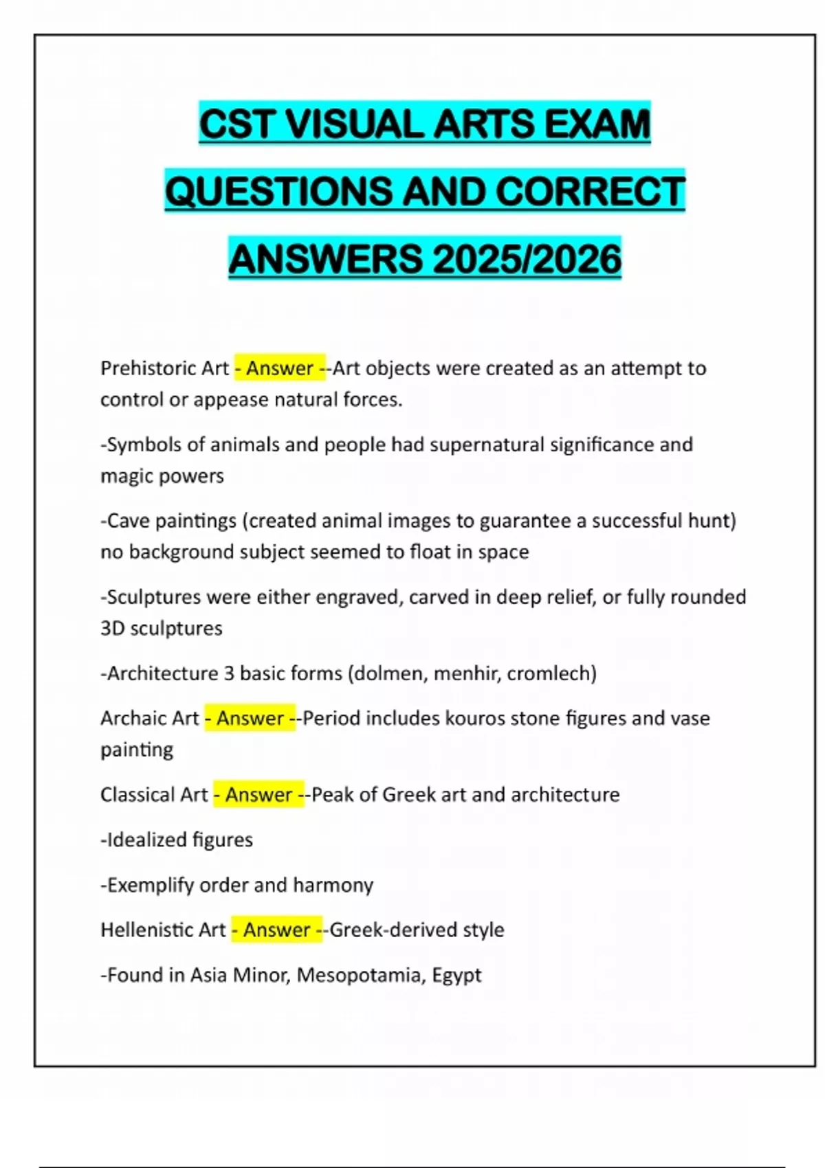 CST VISUAL ARTS EXAM QUESTIONS AND CORRECT ANSWERS 2025/2026 Prehistoric Art - Answer --Art objects were created as an attempt to control or appease natural forces. -Symbols of animals and people had supernatural significance and magic powers -Cave paintings (created animal images to guarantee a successful hunt) no background subject seemed to float in space -Sculptures were either engraved, carved in deep relief, or fully rounded 3D sculptures -Architecture 3 basic forms (dolmen, menhir, cromlech) Archaic Art - Answer --Period includes kouros stone figures and vase painting Classical Art - Answer --Peak of Greek art and architecture -Idealized figures -Exemplify order and harmony Hellenistic Art - Answer --Greek-derived style -Found in Asia Minor, Mesopotamia, Egypt-More melodramatic than Classical style Navaho Art - Answer --Southwest tribe known for geometric-design rugs colored with herbal and mineral dyes, especially carmine red. -Shamans created sand paintings to heal disease, promote fertility, or assure a successful hunt. Hopi Art - Answer --Carved and painted kachina dolls out of cottonwood roots to represent gods and teach religion -Also decorated ceremonial underground kivas in Arizona with elaborate mural paintings of agriculture deities Kwakiutl Art - Answer --Northwest coast tribe that produced totem poles, masks, and decorated houses and canoes -Facial features of masks exaggerated in forceful wood carvings. Eskimo Art - Answer --Alaskan tribe that carved masks with moving parts used by shamans -Often combined odd materials in surprising ways Mayan Art - Answer --In Guatemala and Mexico, Mayans created enormous temples in stepped-pyramid form -Huge limestone temples were richly carved with relief sculpture and hieroglyphics. Aztec Art - Answer --Produced massive statues of gods who demanded regular human sacrifices -Skilled in gold work