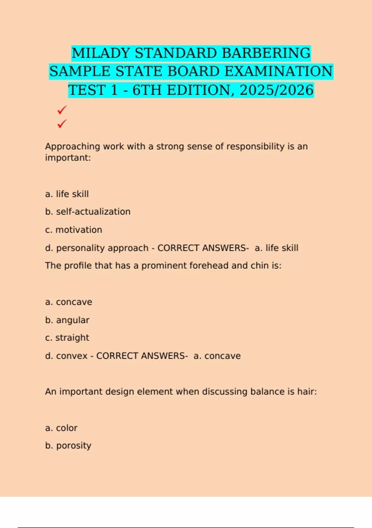 MILADY STANDARD BARBERING SAMPLE STATE BOARD EXAMINATION TEST 1 - 6TH EDITION, 2025/2026