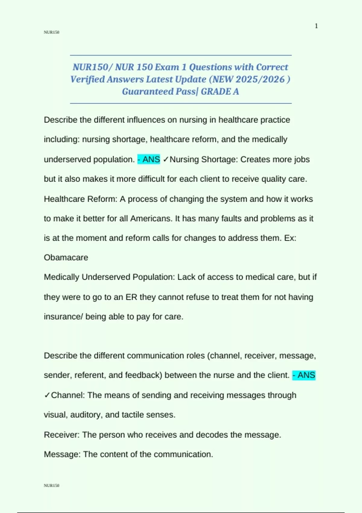 NUR150/ NUR 150 Exam 1 Questions with Correct