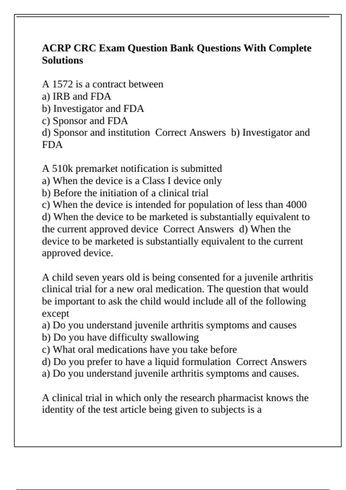 ACRP CRC Exam Question Bank Questions With Complete Solutions